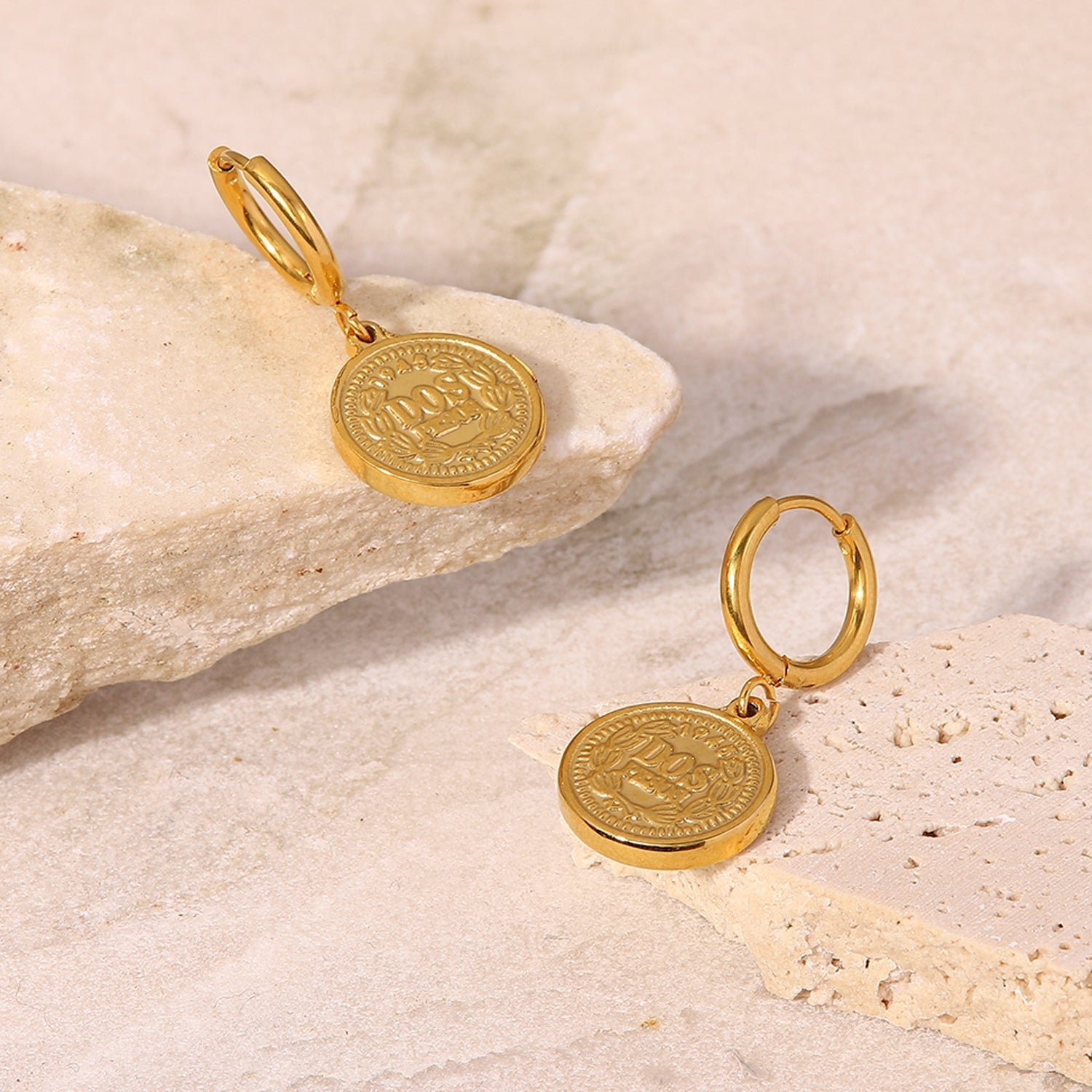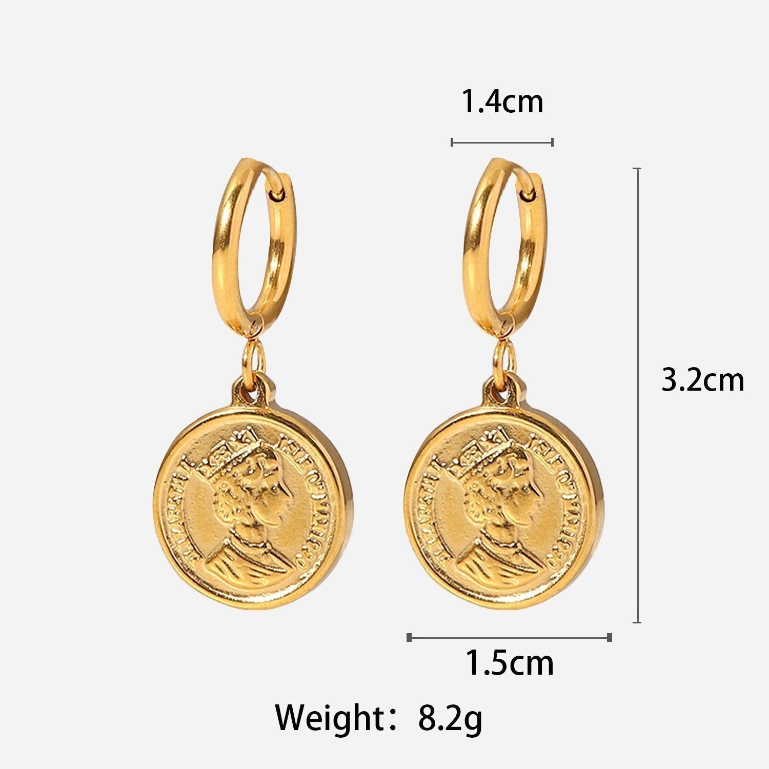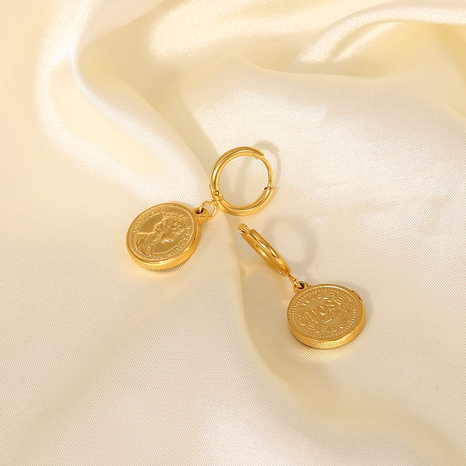 Ohrringe im minimalistischen Stil mit 18 Karat vergoldetem Münzanhänger mit Königin Elisabeth für flippige und sportliche Leute. Ultrahochwertiger Ohrring mit mattierter Perlenkette und Nähten.