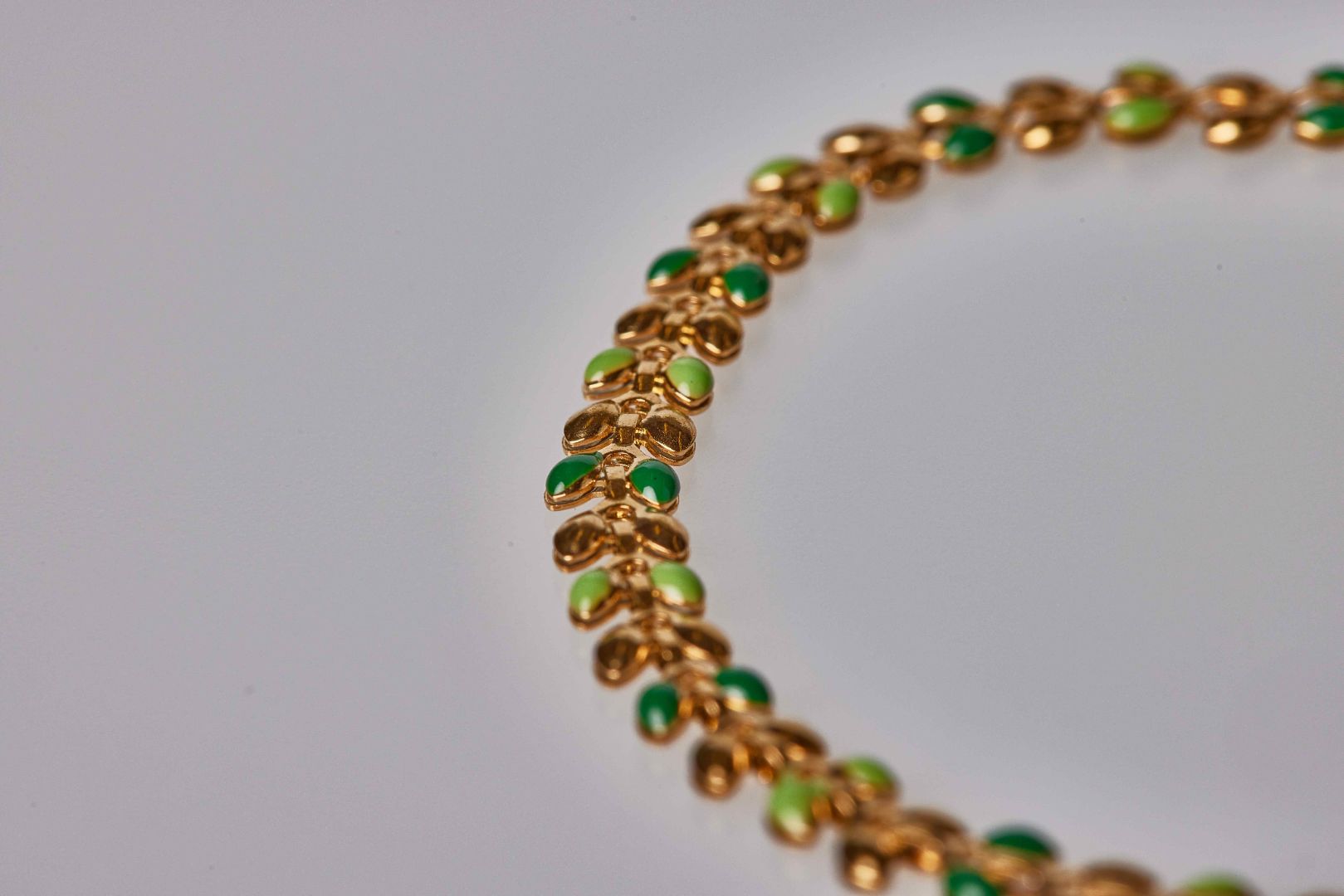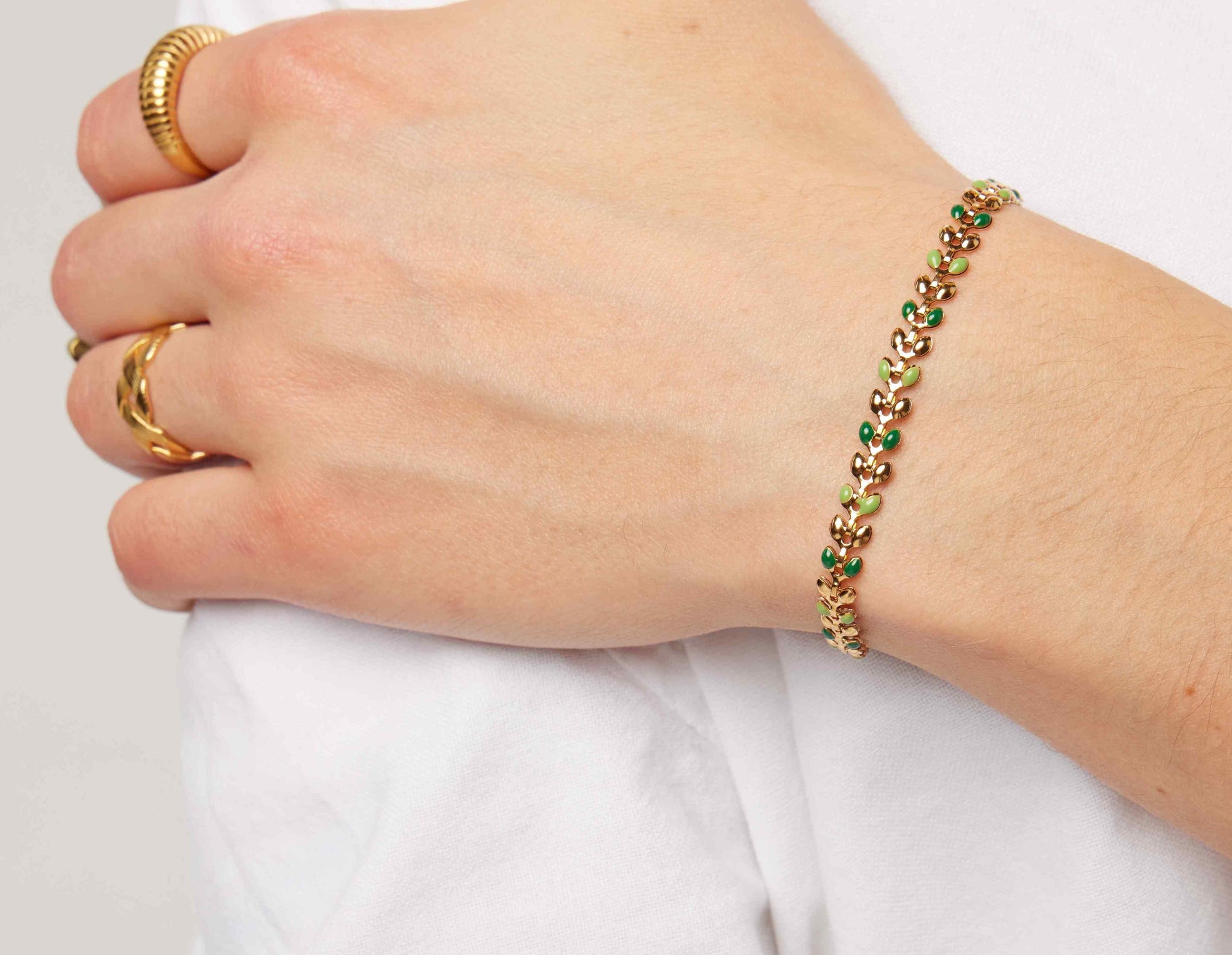 Treten Sie ein in die bezaubernde Welt des Daphne-Armbands – ein Meisterwerk, das mit zwei Grüntönen geschmückt ist und ein exquisites Bild ergibt, das von Daphne-Blättern inspiriert ist. Dieses Armband ist ein botanischer Hochgenuss und bietet eine einzigartige und von der Natur inspirierte Ästhetik. Ob allein getragen, um sein kompliziertes Design zu präsentieren, oder in Kombination mit anderen Armbändern für ein vom Garten inspiriertes Ensemble – das Daphne-Armband verleiht Ihrem Handgelenk einen Hauch botanischer Eleganz.