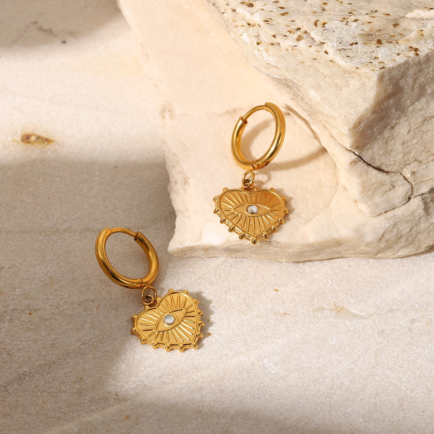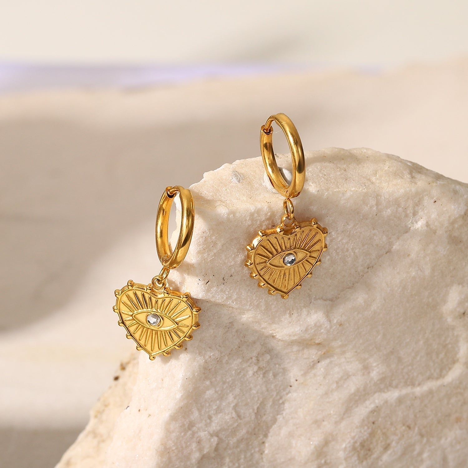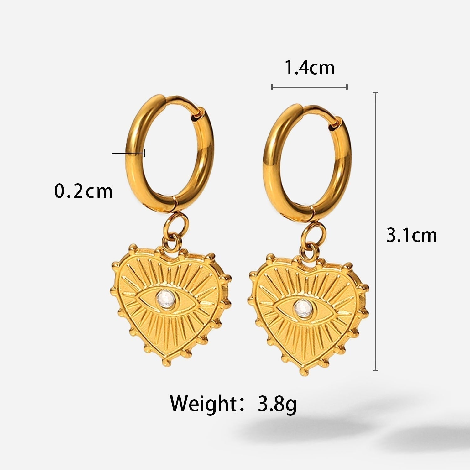 Estos pendientes presentan un patrón único de ojos malvados que es elegante y encantador . El colgante en forma de corazón agrega un toque de romance al look general . Los pendientes están hechos de materiales de alta calidad y son livianos y cómodos de usar . Seguro que agregarán un toque de sofisticación a cualquier atuendo .