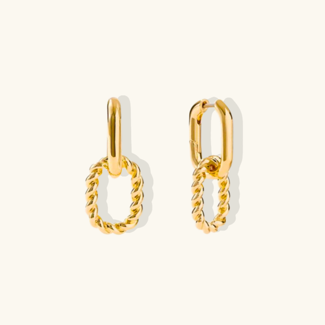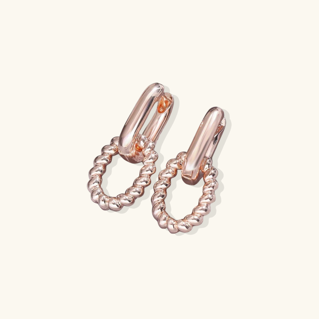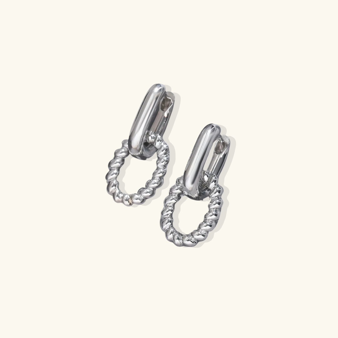 Los pendientes de aro Lauren Drop irradian elegancia y un atractivo atemporal. Su forma ovalada retorcida, suspendida de unos aros elegantes y únicos, aporta un toque de refinamiento clásico. La delicada textura similar a una cuerda del óvalo contrasta con la superficie lisa del aro superior, creando un diseño dinámico pero sobrio.