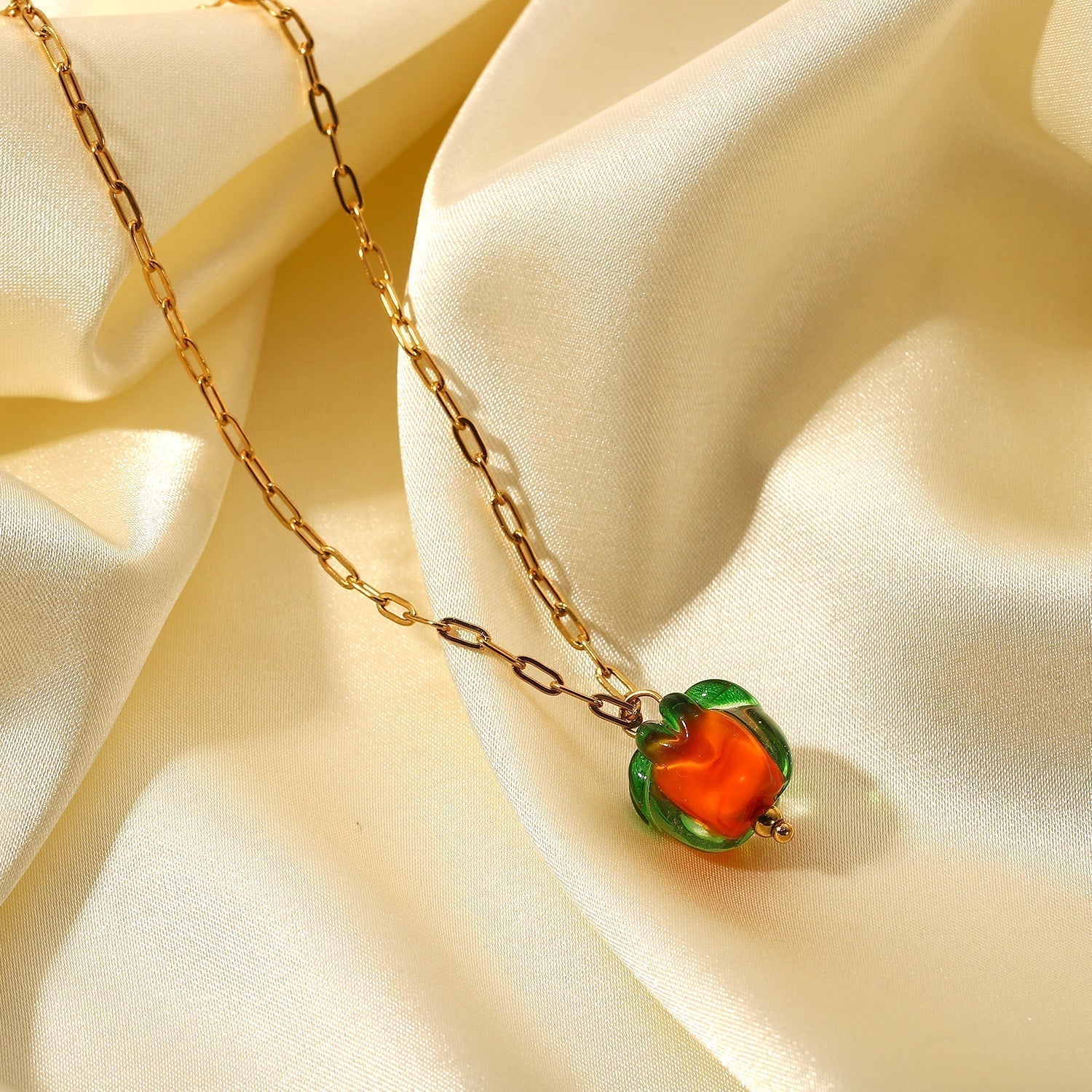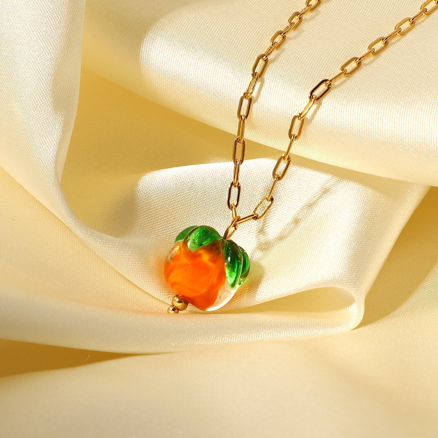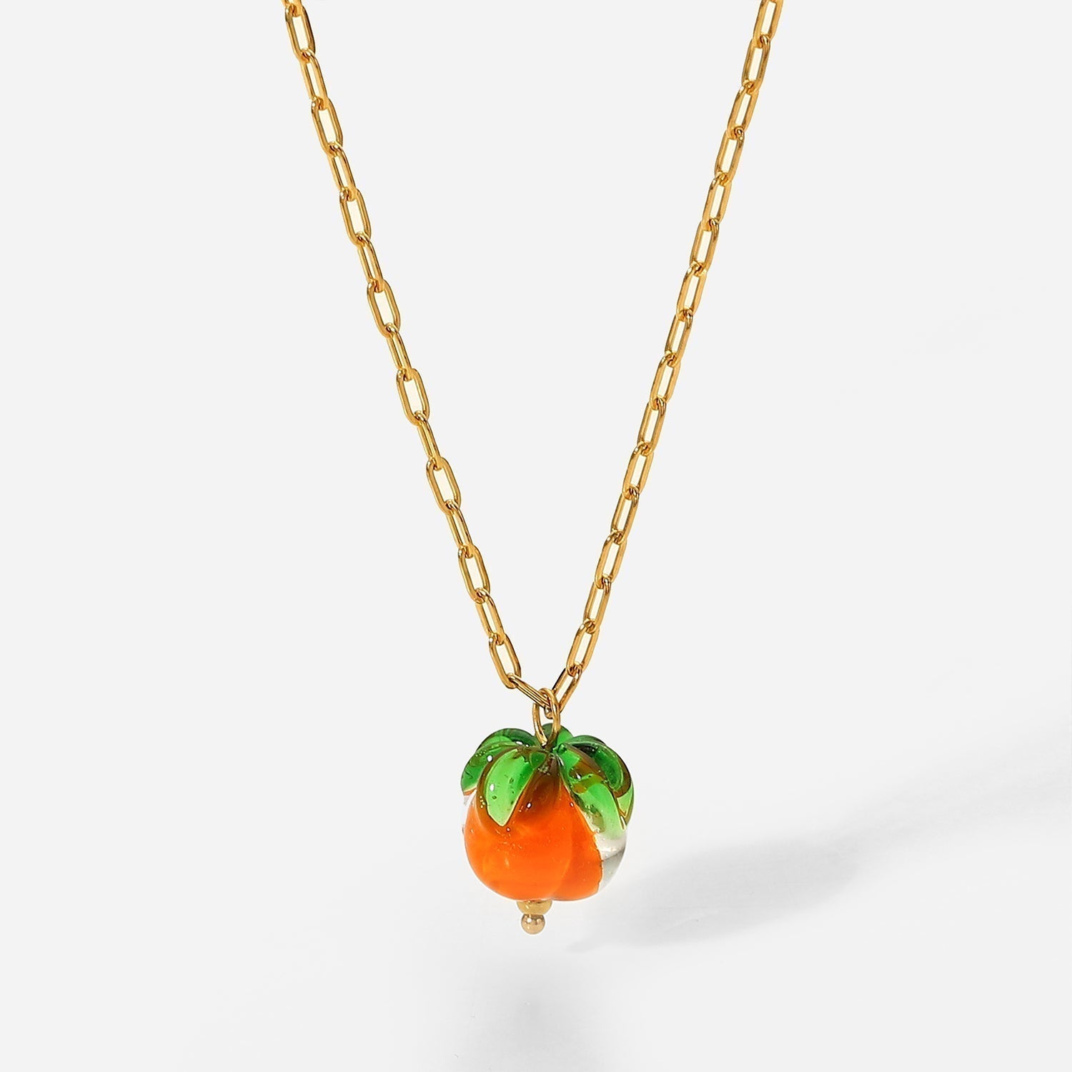 Hermoso collar con colgante de cuentas de vidrio. Cadena de eslabones de acero inoxidable en oro de 18 quilates. Un collar elegante y moderno con un colgante de fruta divertido para el verano.