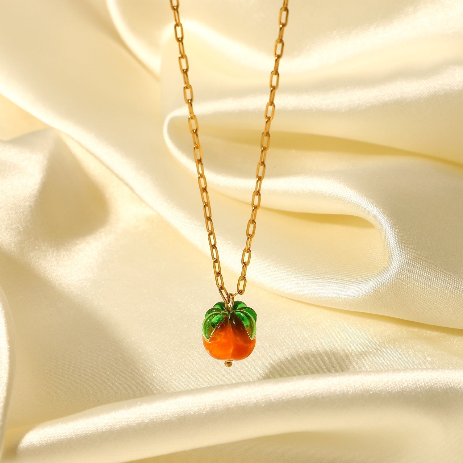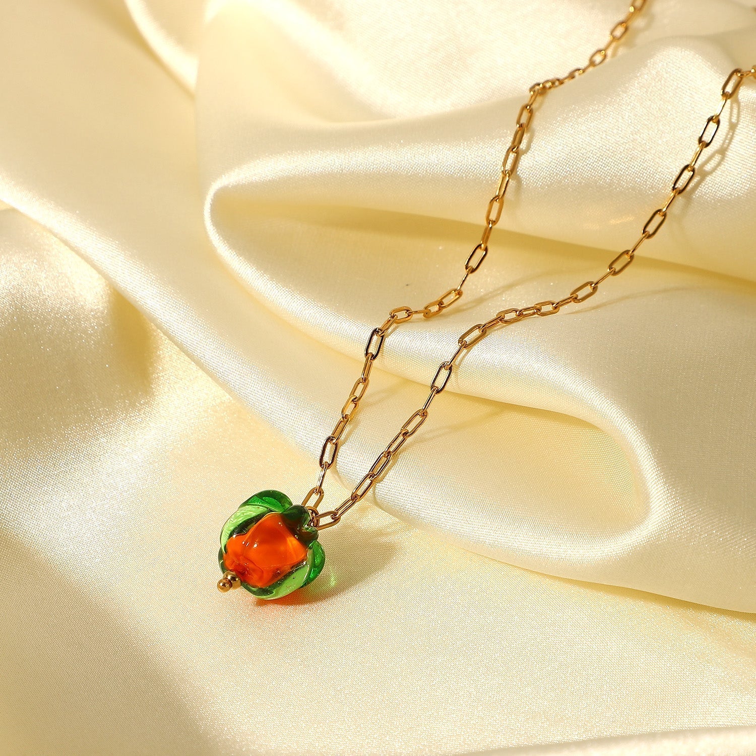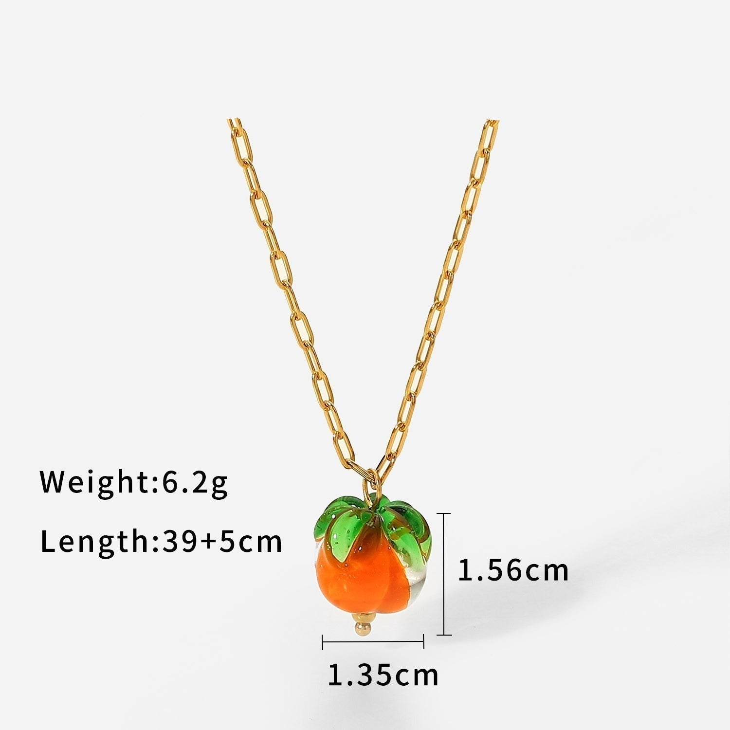 Hermoso collar con colgante de cuentas de vidrio. Cadena de eslabones de acero inoxidable en oro de 18 quilates. Un collar elegante y moderno con un colgante de fruta divertido para el verano.