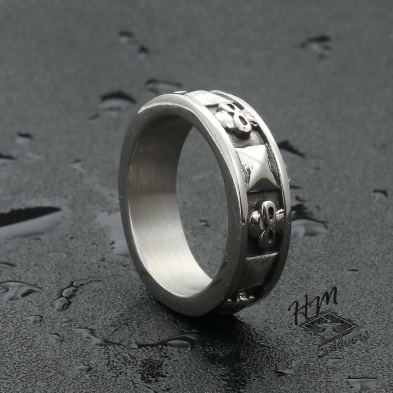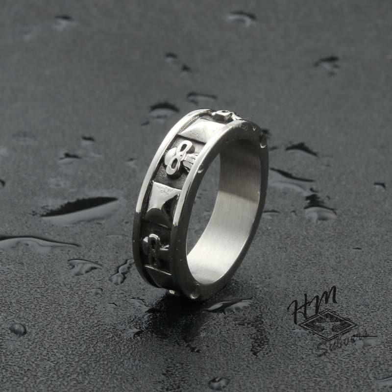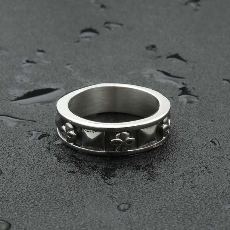 Esta calavera está hecha de acero inoxidable de alta calidad, es gruesa y tiene detalles excepcionales. Ha sido elaborada cuidadosamente para durar incluso en los momentos más difíciles. Este anillo de acero inoxidable emite un sonido auténtico cuando se usa y seguramente atraerá la atención. Un anillo de hombre real, un anillo de acero inoxidable para hombre real.