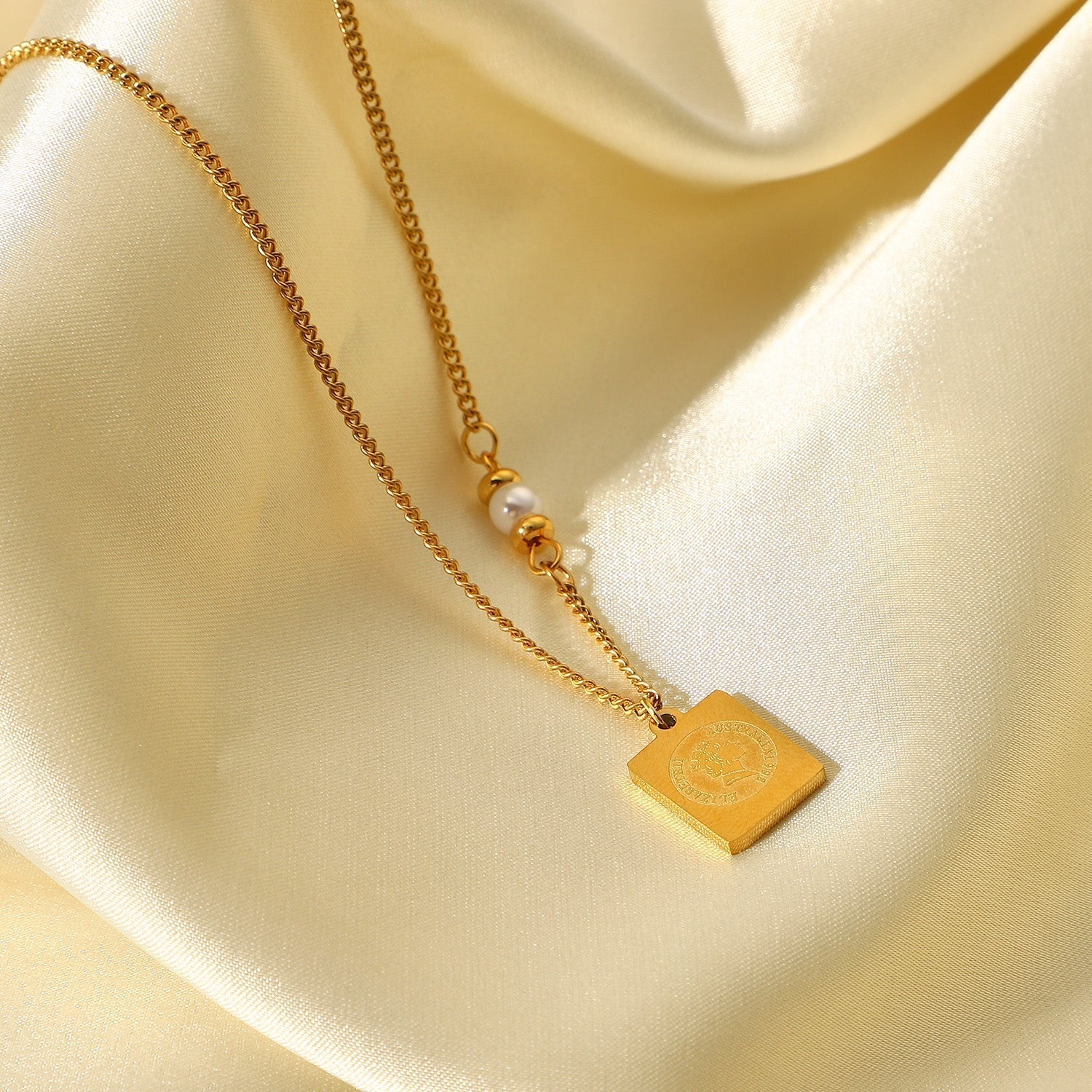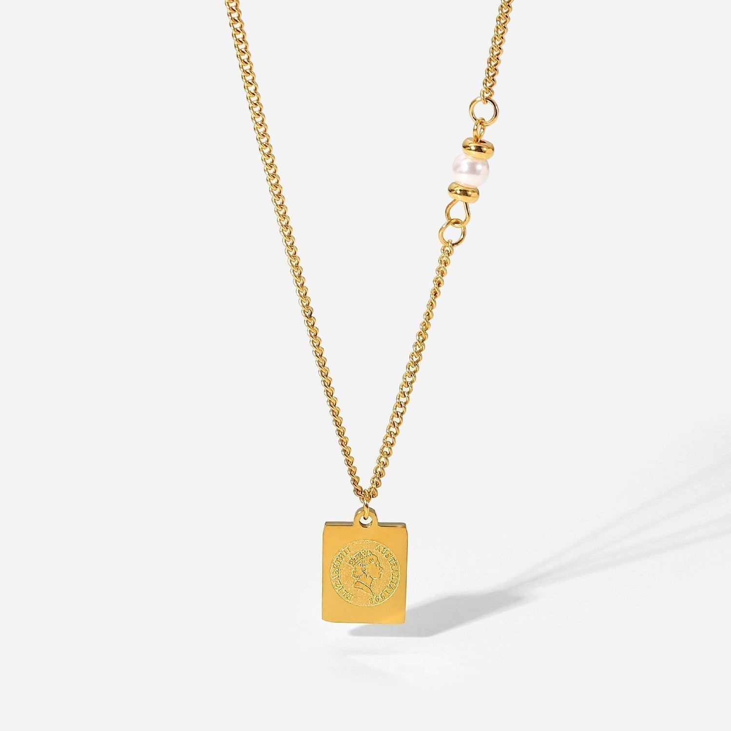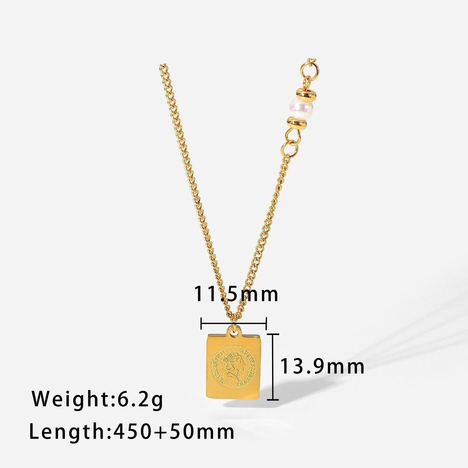 Collar con colgante rectangular de estilo retro tallado de la reina Isabel. Elegante collar de perlas de agua dulce. Viene con una cadena pulida de alta calidad.