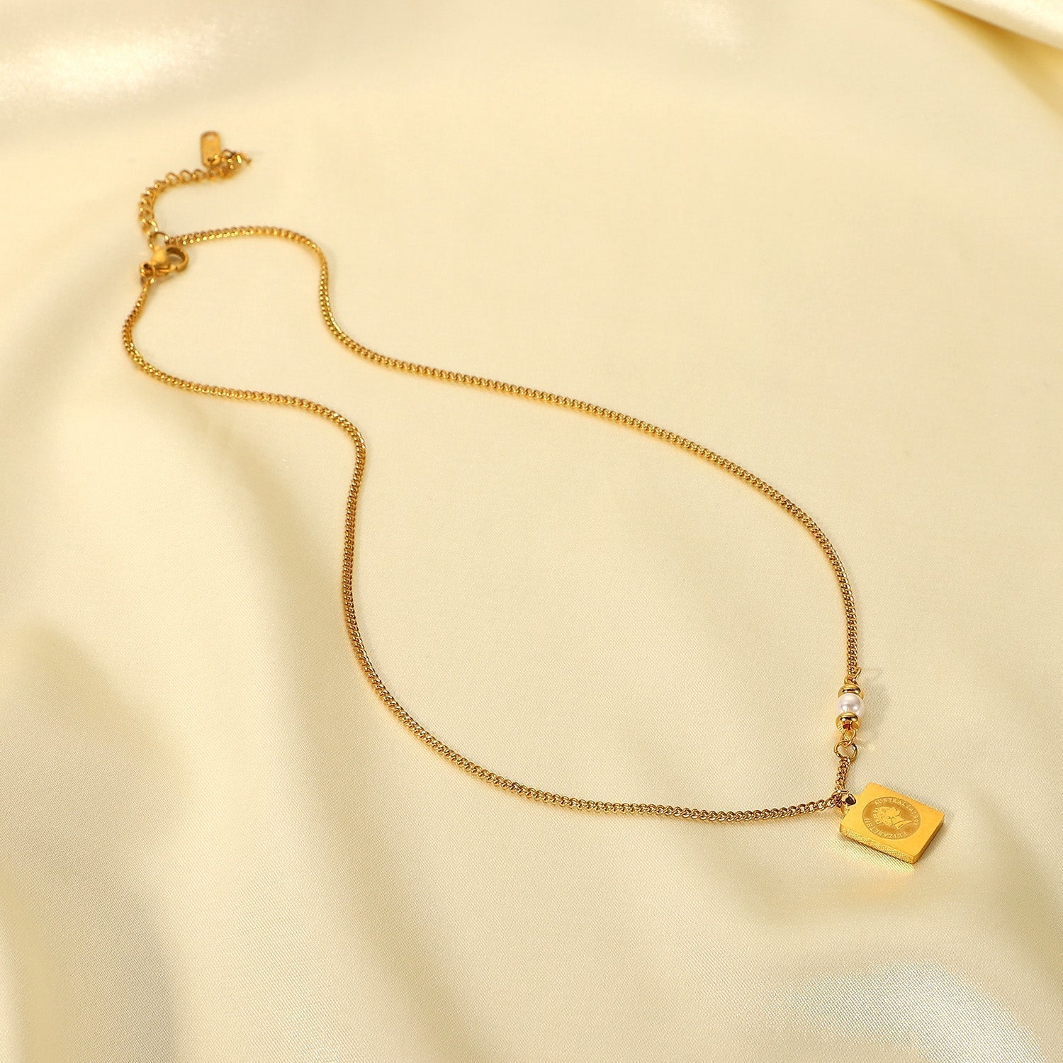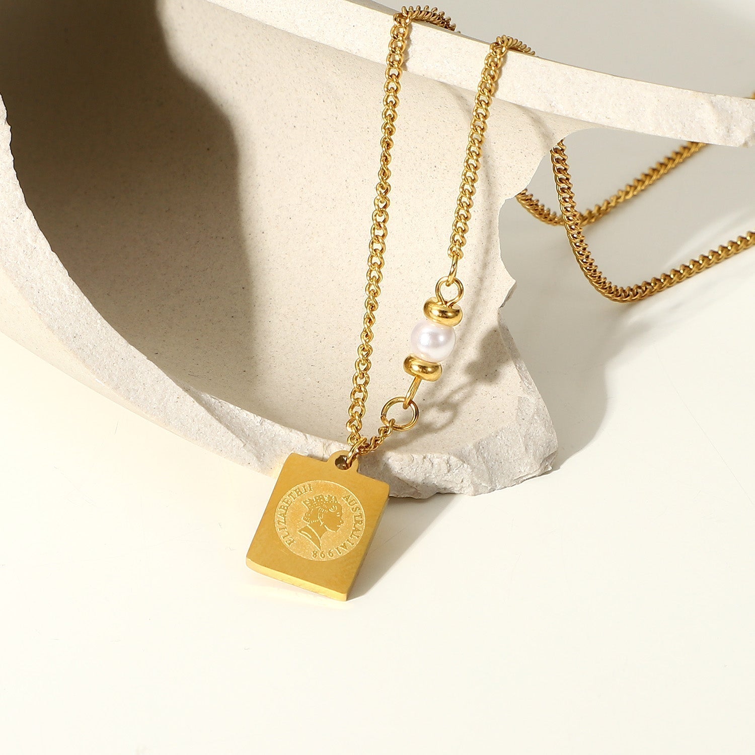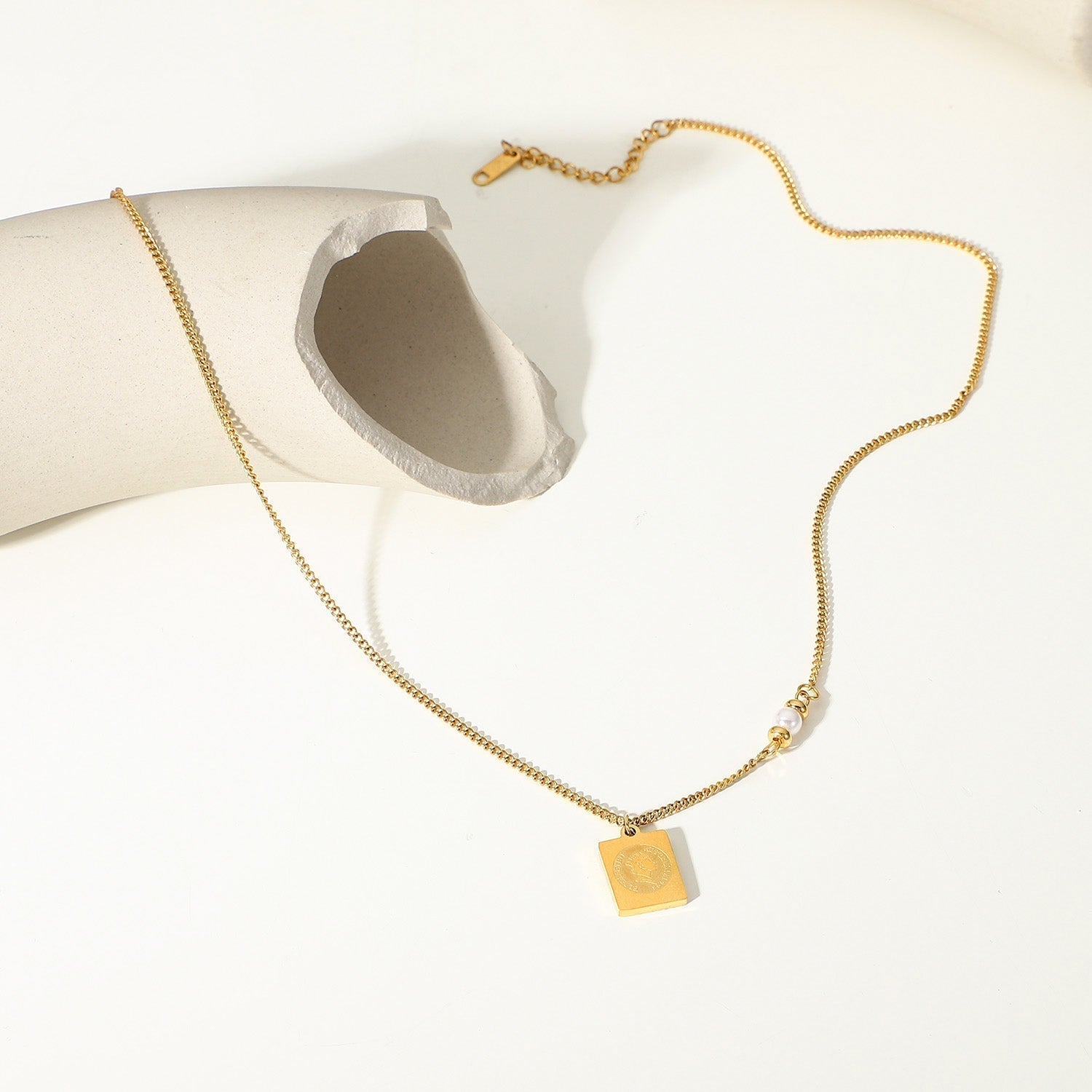 Collar con colgante rectangular de estilo retro tallado de la reina Isabel. Elegante collar de perlas de agua dulce. Viene con una cadena pulida de alta calidad.