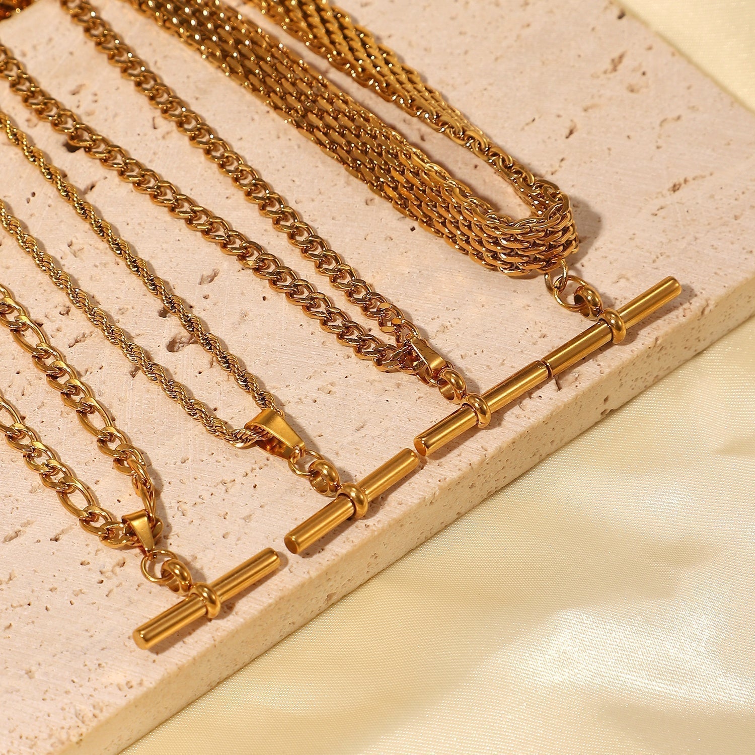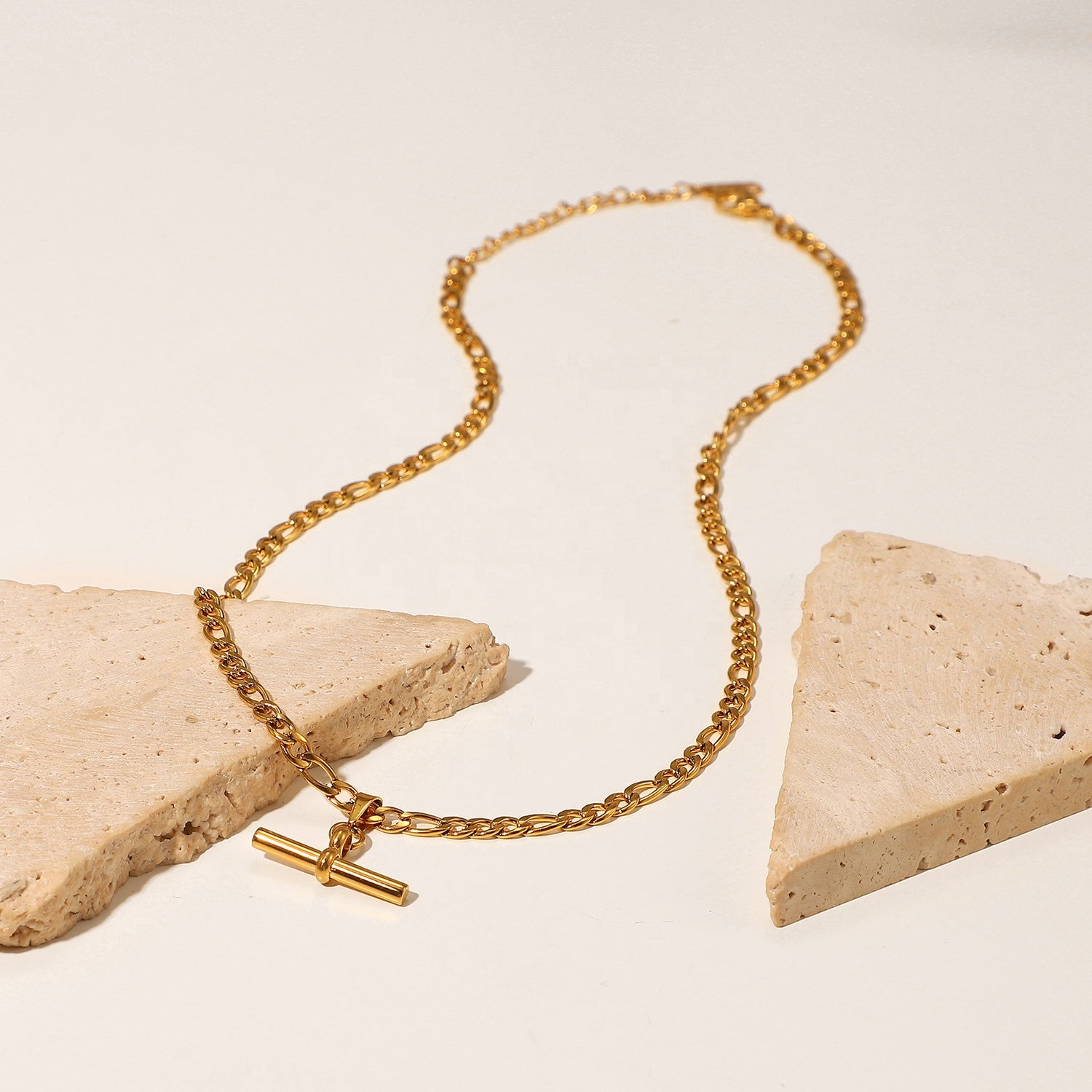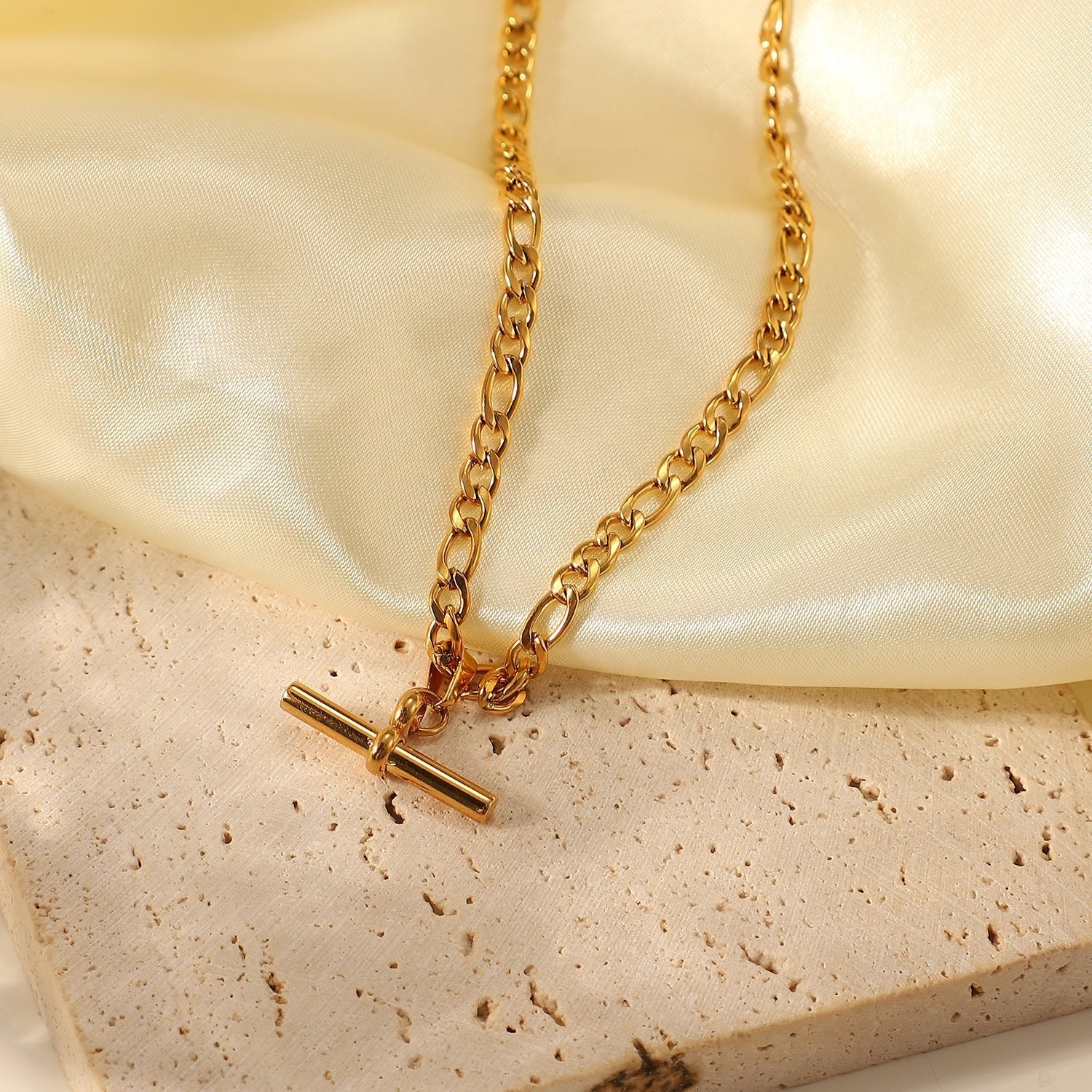 Esta cadena Figaro bañada en oro de 18 K que no se deslustra presenta un elegante colgante con barra en T. Es un accesorio perfecto para tu atuendo casual diario, que agrega un toque de clase y elegancia. El diseño resistente y duradero garantiza que durará mucho tiempo, y su estilo simple y atemporal garantiza que nunca pasará de moda. Ya sea que estés buscando un nuevo collar para completar tu atuendo o un regalo para esa persona especial, esta es una opción perfecta.
