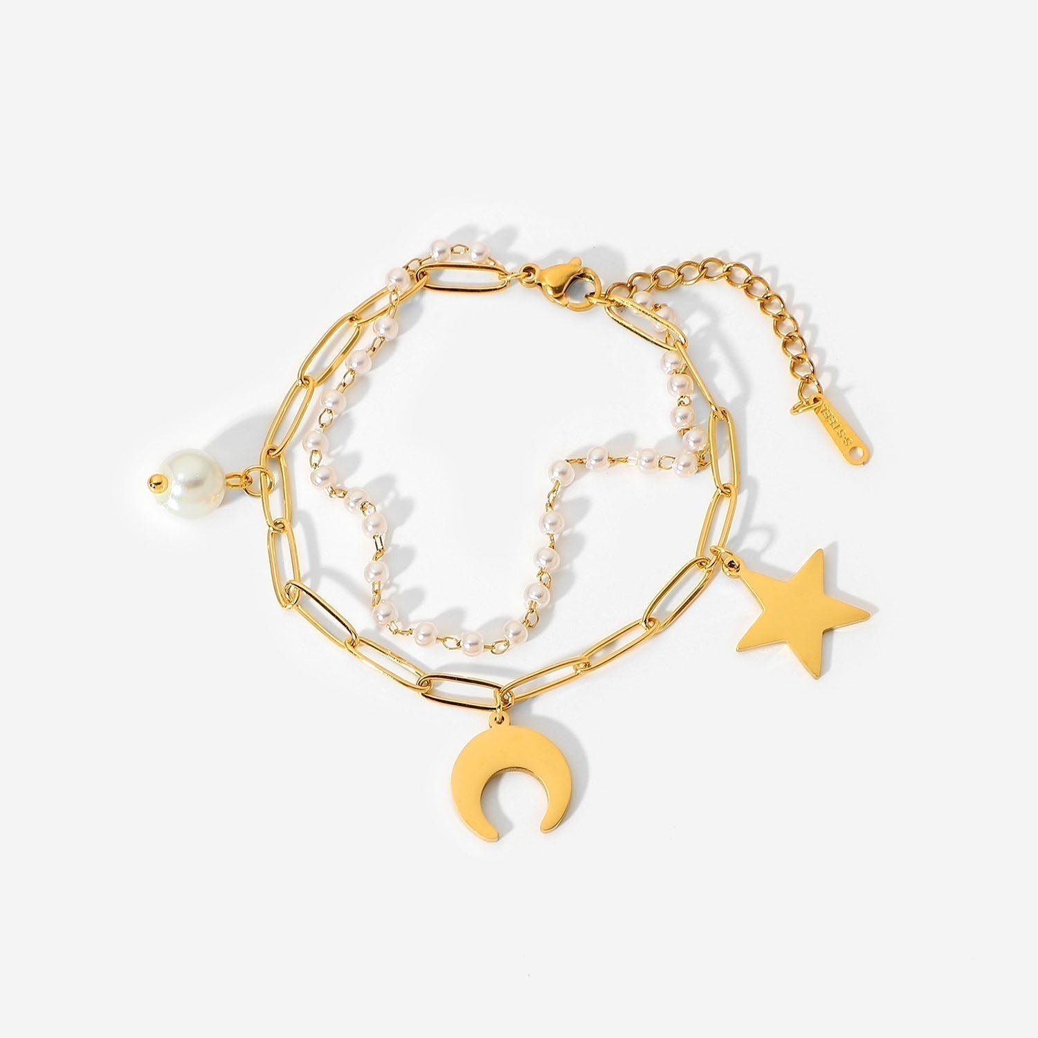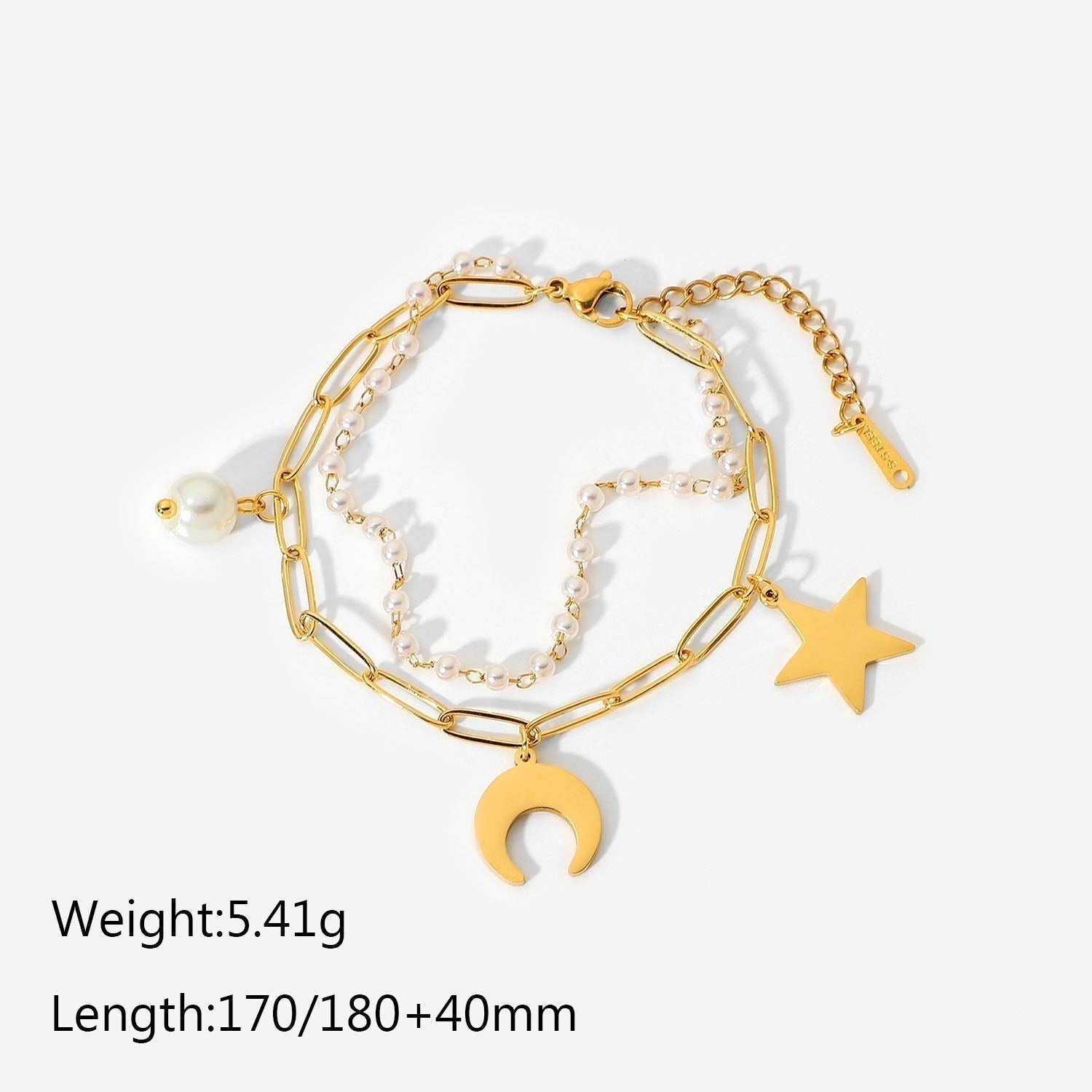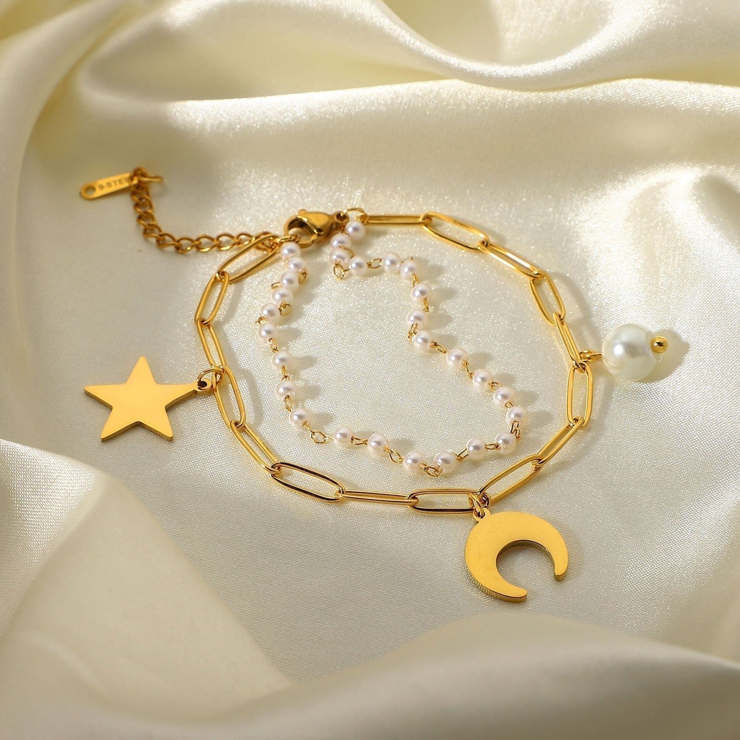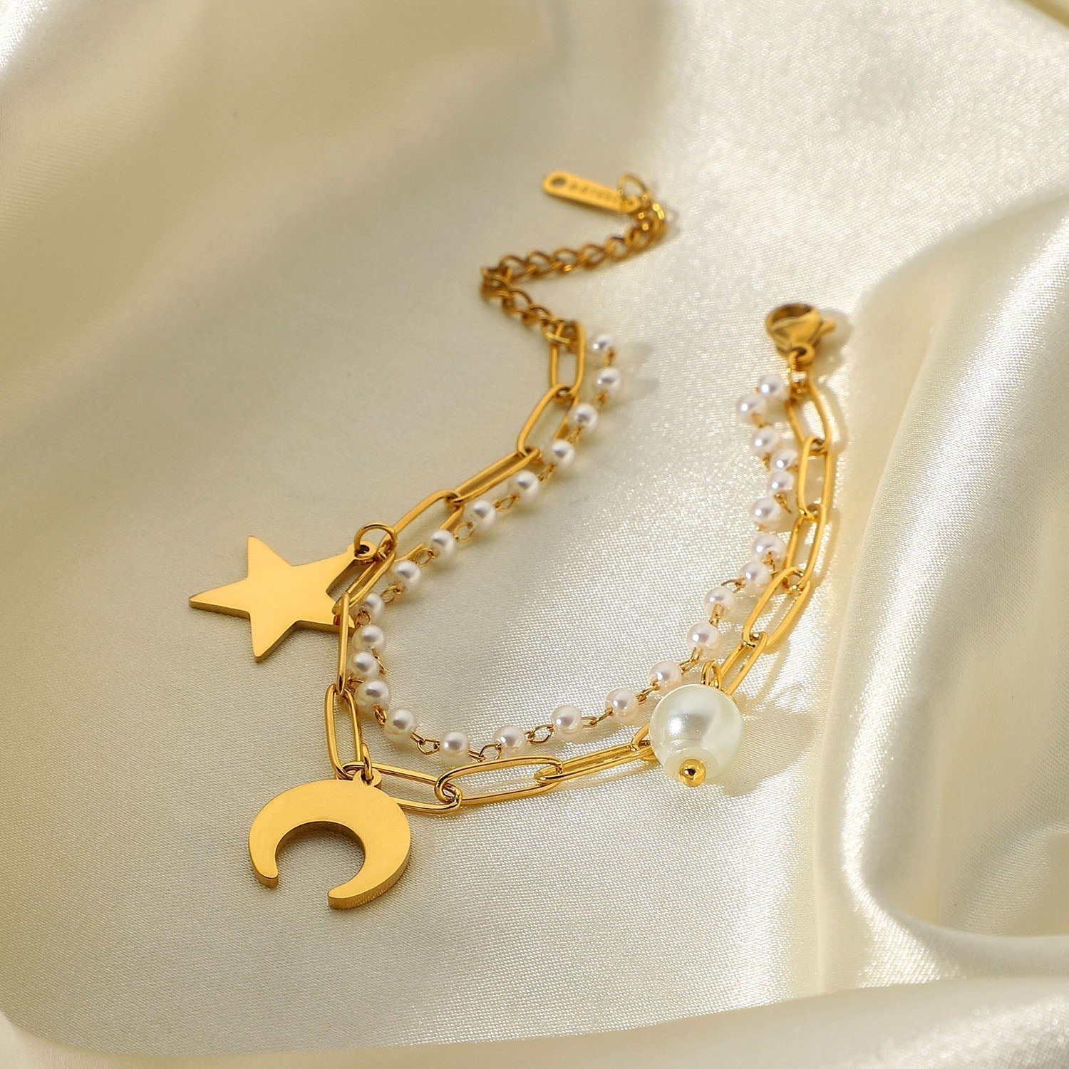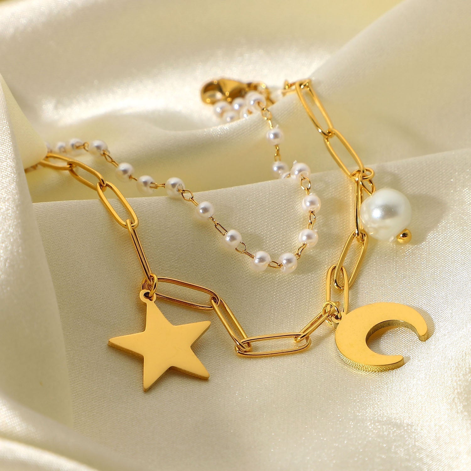 This Bohemian-style gold color star and moon bracelet is perfect for adding a touch of trendiness to any outfit. The bracelet is made from high-quality gold-plated material and features a unique star and moon charm. It has a vintage-inspired design that makes it perfect for adding a touch of style to any look. The bracelet is lightweight and comfortable to wear for long periods of time. It is sure to be the perfect accessory for any occasion.