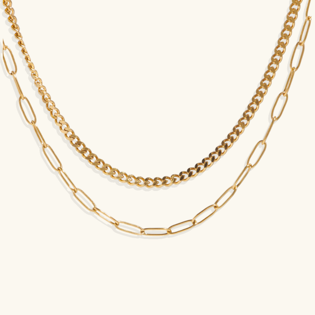 The Bella Layered Necklace embodies effortless elegance and layered sophistication. Featuring a dual-chain design, with one being a bold paperclip link and the other a classic curb chain, this piece strikes the perfect balance between edgy and timeless. The golden hues glimmer against the skin, creating a luxurious yet understated look.