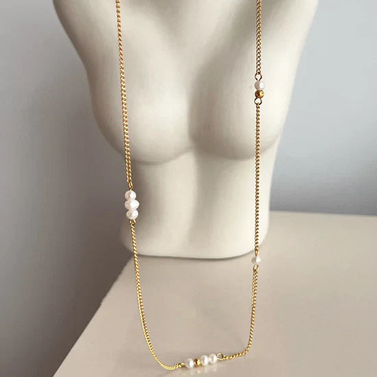 Delicate and enchanting, the Camilla Pearl Necklace whispers of timeless elegance with a modern touch. Its delicate golden chain flows effortlessly, accented by soft clusters of petite pearls, each bead like a captured droplet of light.