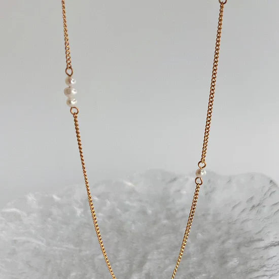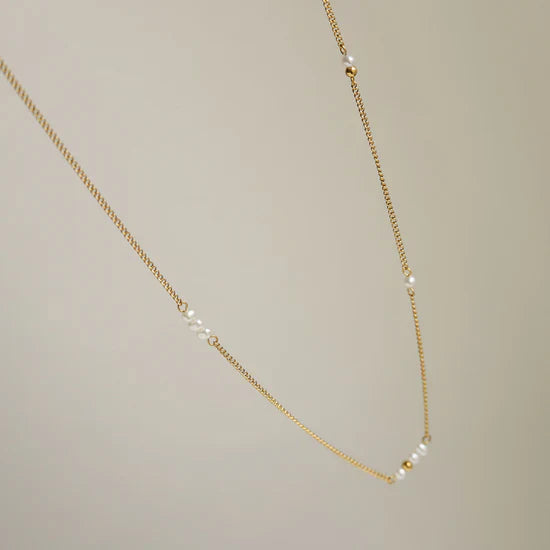 Delicate and enchanting, the Camilla Pearl Necklace whispers of timeless elegance with a modern touch. Its delicate golden chain flows effortlessly, accented by soft clusters of petite pearls, each bead like a captured droplet of light.