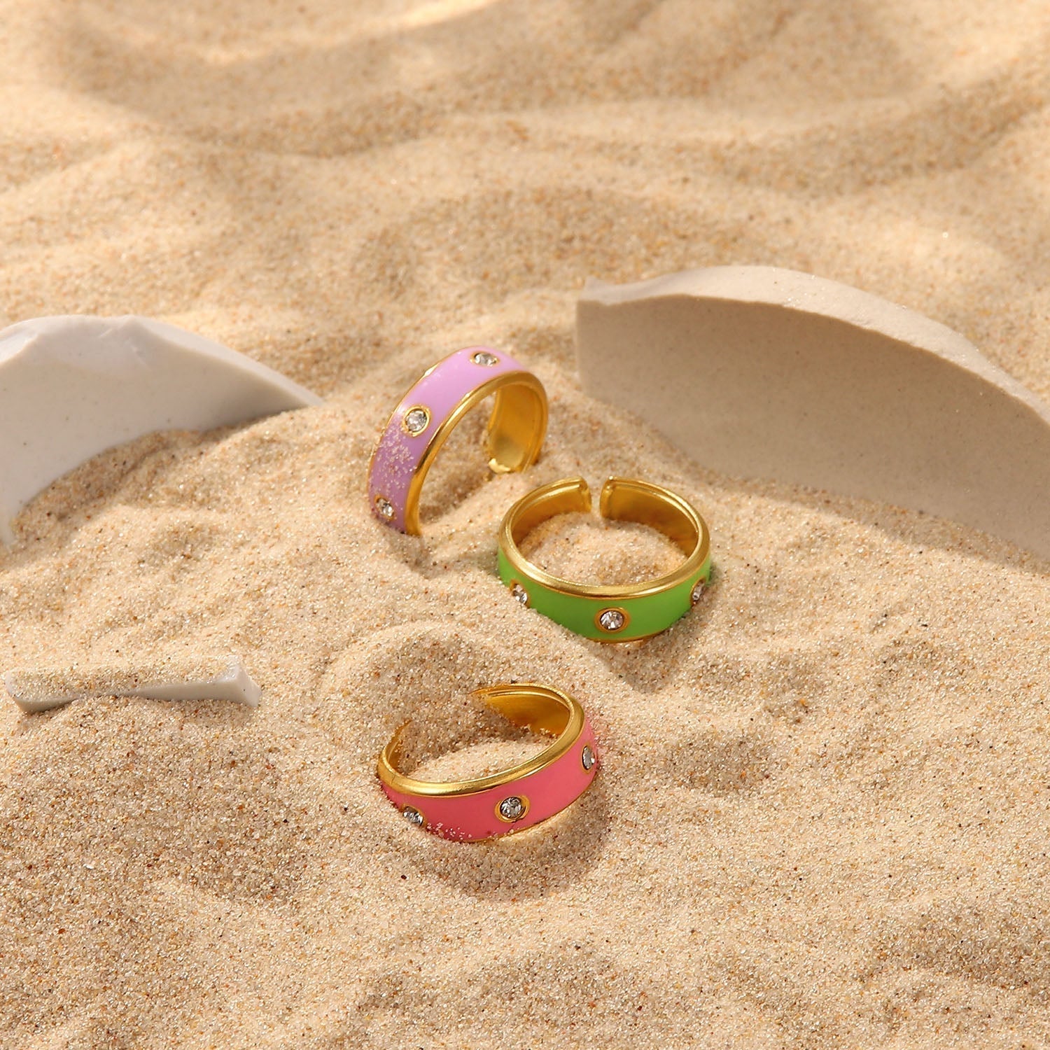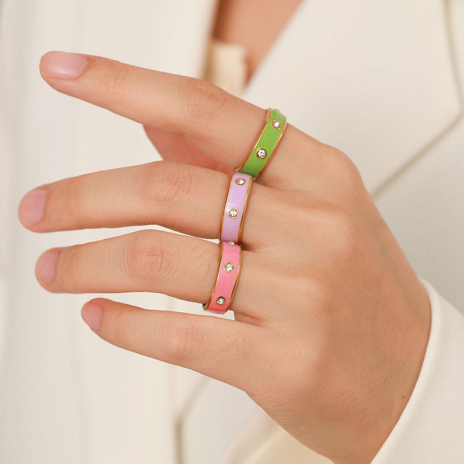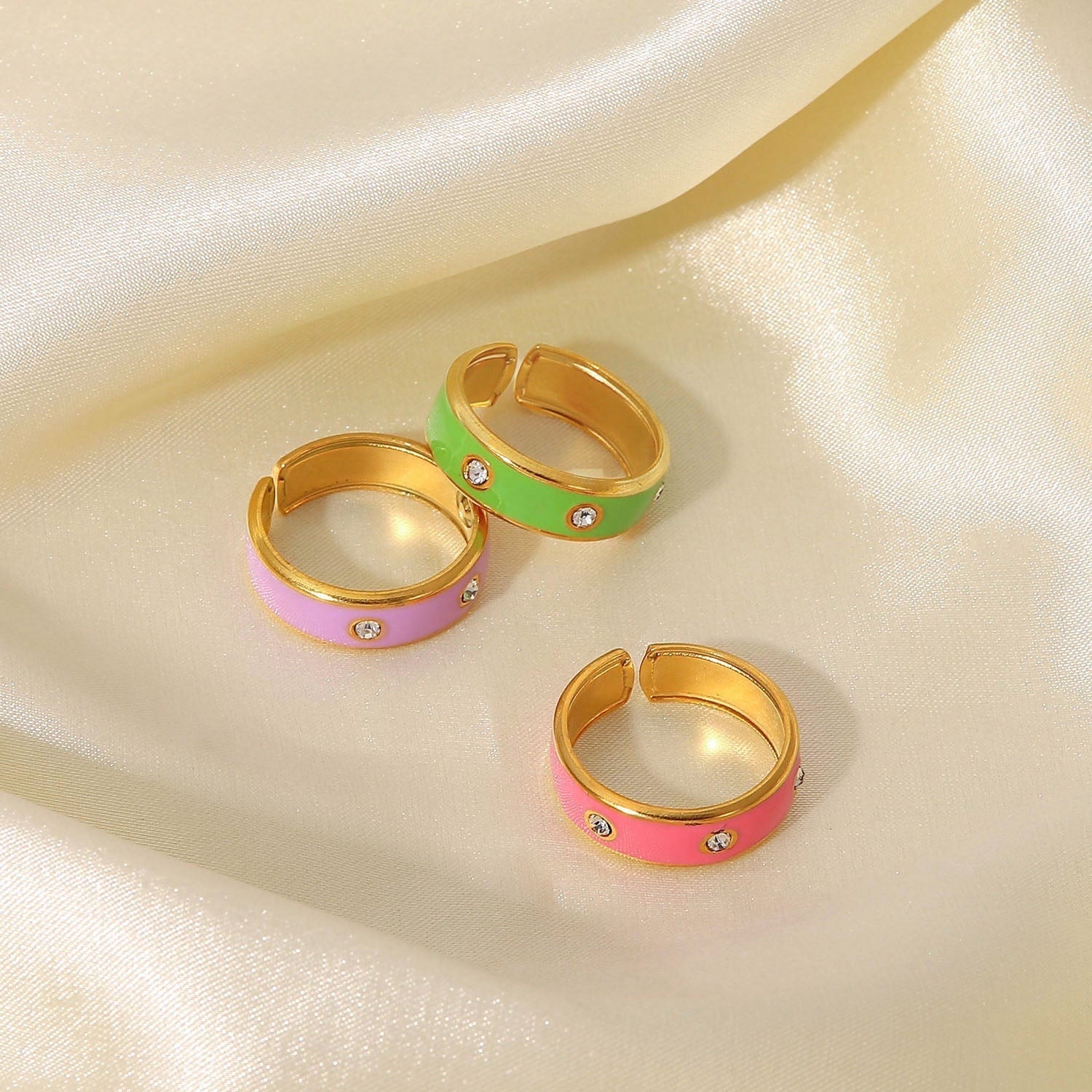 This ring is perfect for everyday style and makes a great statement piece. It is made of high-quality 18K gold plated material and features a vibrant enamel finish. The ring is adorned with sparkling Cubic Zirconia studs for a touch of sparkle. The ring is comfortable and lightweight, making it perfect for everyday wear. It is an ideal gift for yourself or your loved ones.