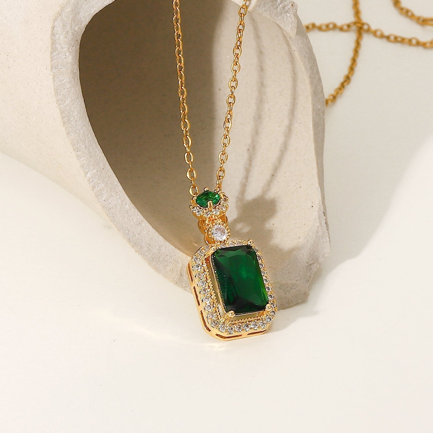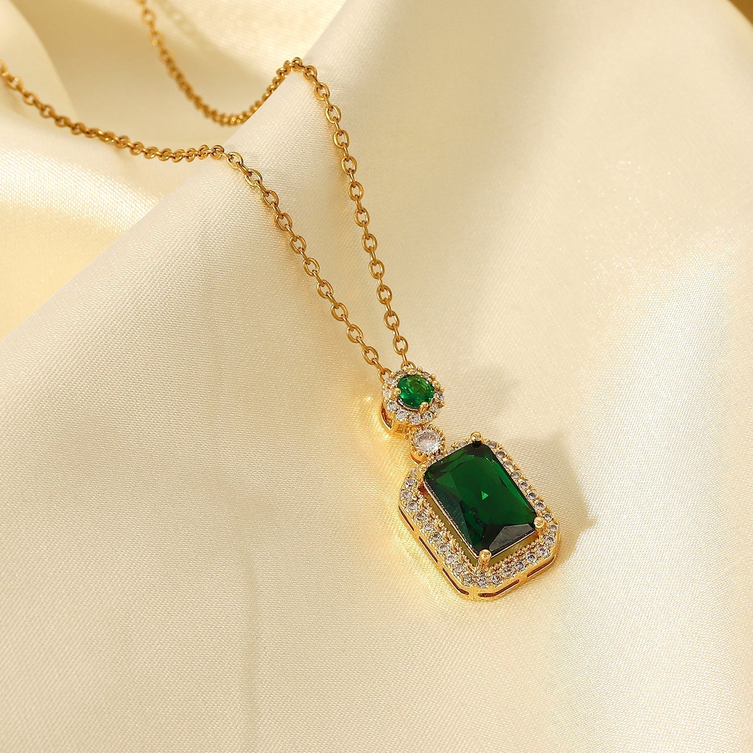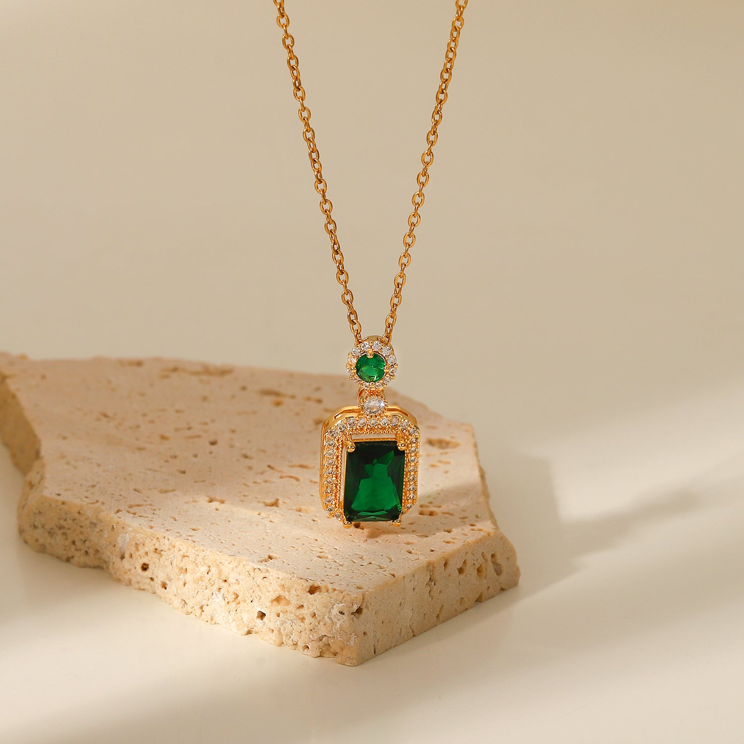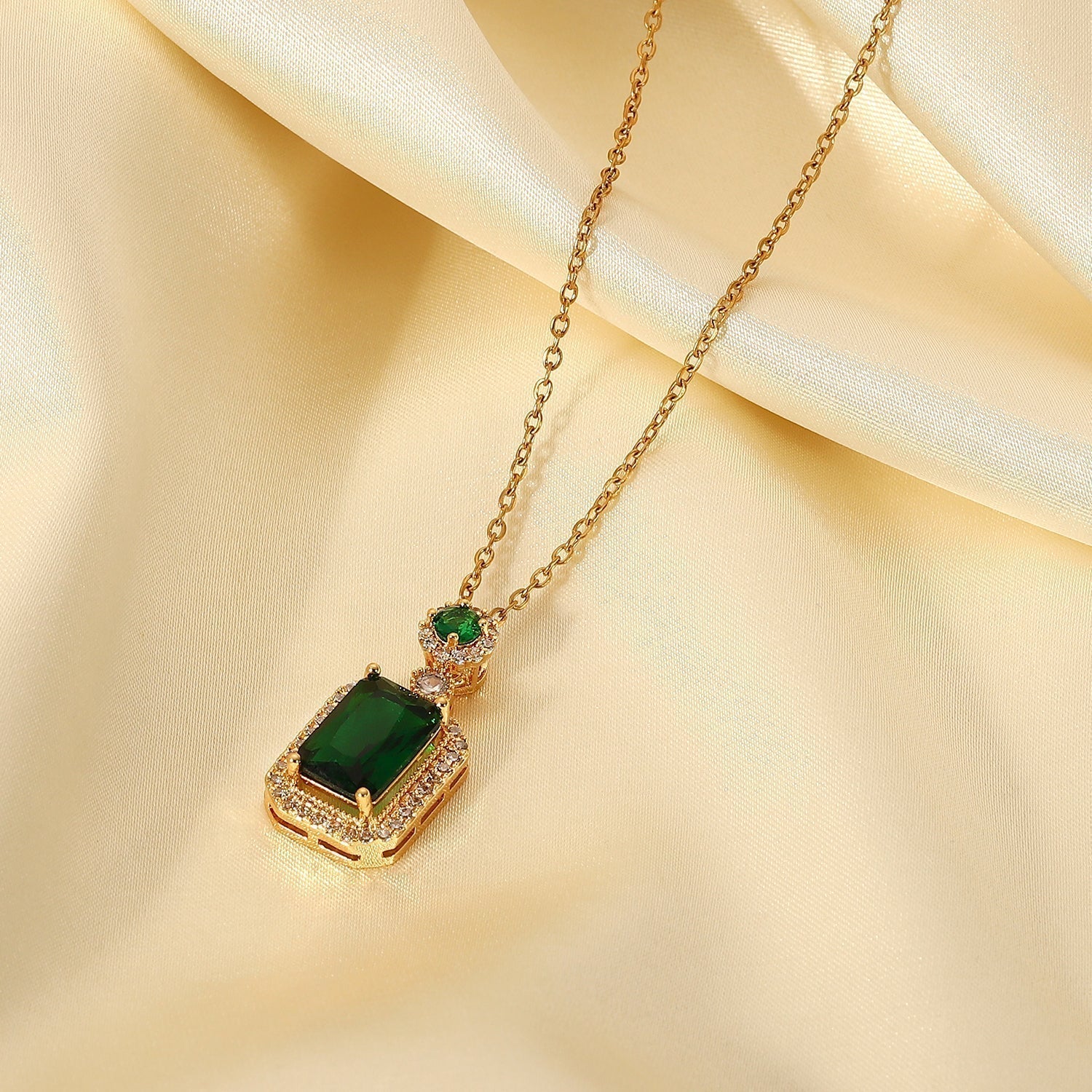 This elegant 18k gold-plated necklace is the perfect accessory. The necklace is made with a high-quality material that is tarnish-free and long-lasting, making it the perfect piece of jewelry that can stand the test of time. The pendant features a beautiful green Cubic Zirconia rectangle, adding a sophisticated and stylish touch. This necklace is perfect for any occasion and looks great when paired with any outfit.
