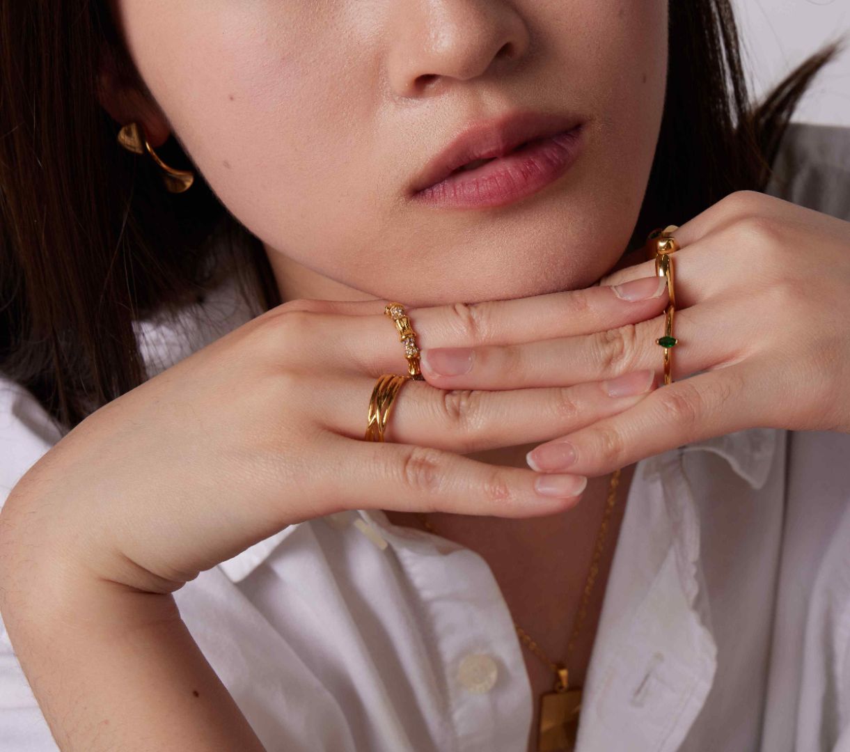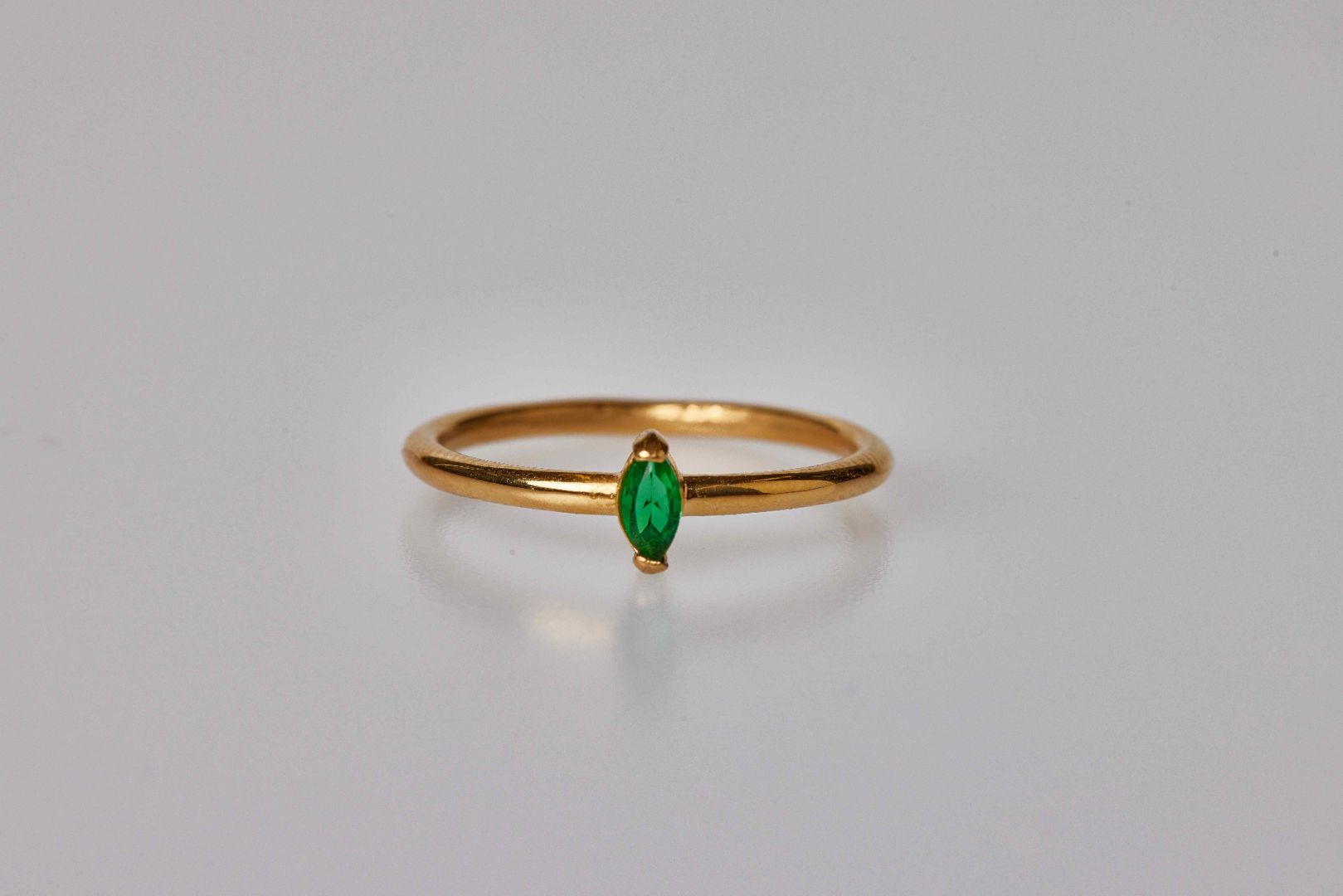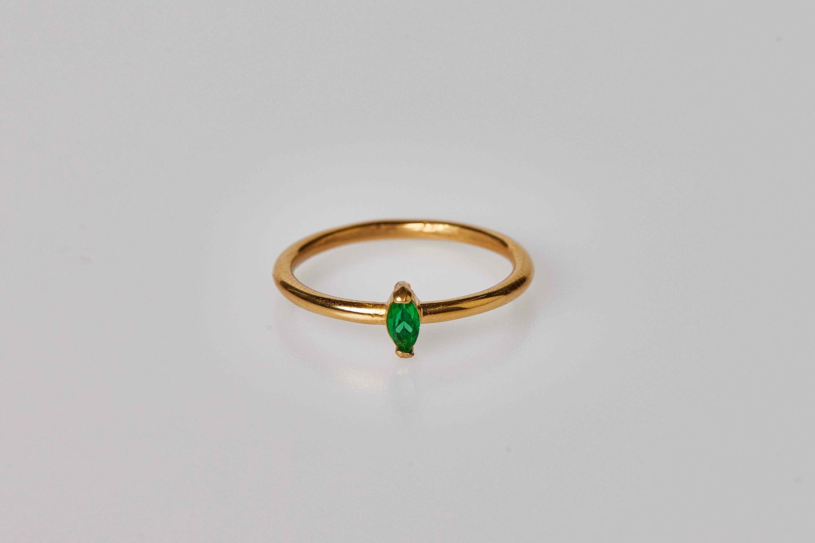 Grace your fingers with the Emerald Romance Ring—a thin and elegant piece adorned with a small green stone, radiating understated sophistication. This delicate ring, inspired by the allure of romance, adds a touch of timeless grace to your every gesture. Versatile and refined, the Emerald Romance Ring can be worn individually for a delicate statement or paired with other rings, allowing you to express your style with versatile simplicity.