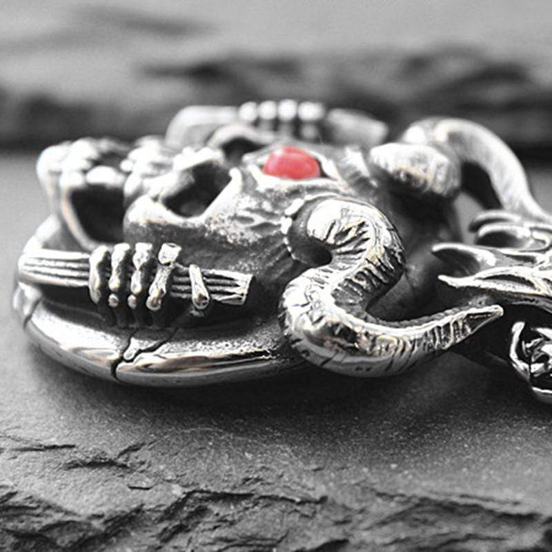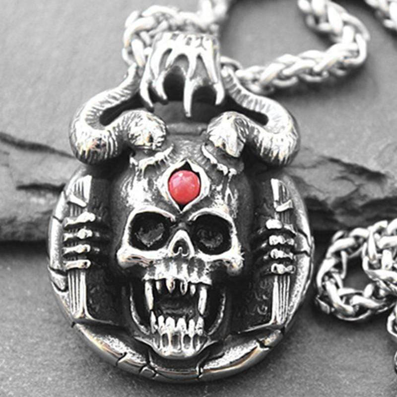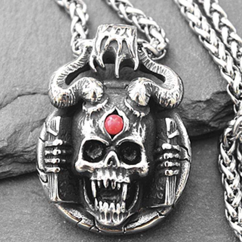This Satan skull pendant is made of high quality stainless steel, is thick, and exceptionally detailed. It has been carefully crafted to last even in the toughest of times. This stainless steel pendant makes an authentic sound when worn and is sure to attract attention. A real men's pendant, a real men's stainless steel pendant.