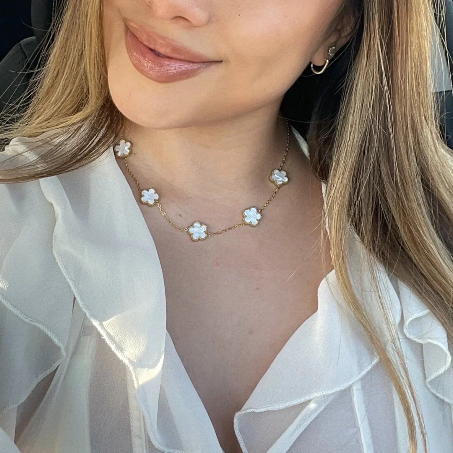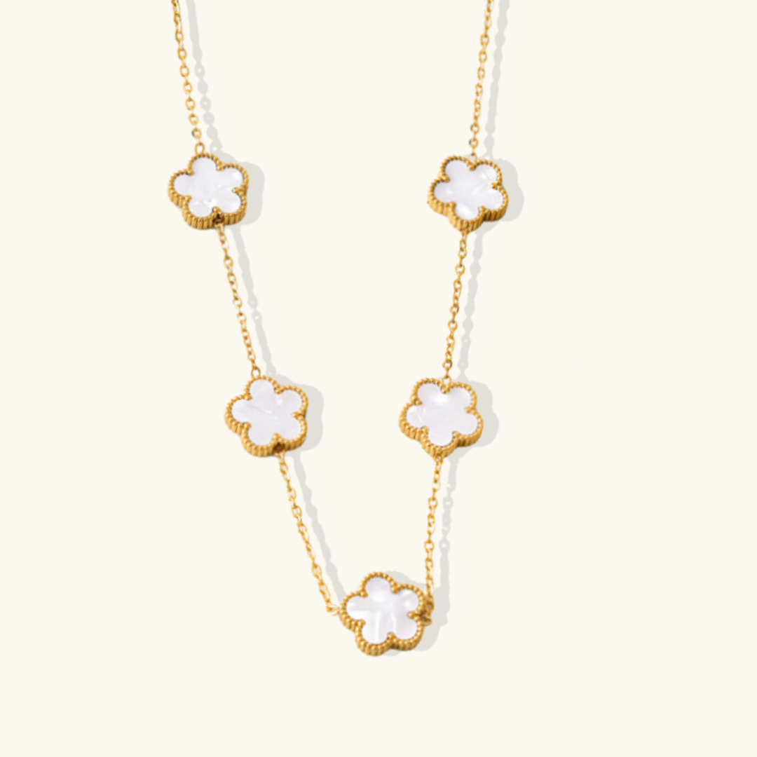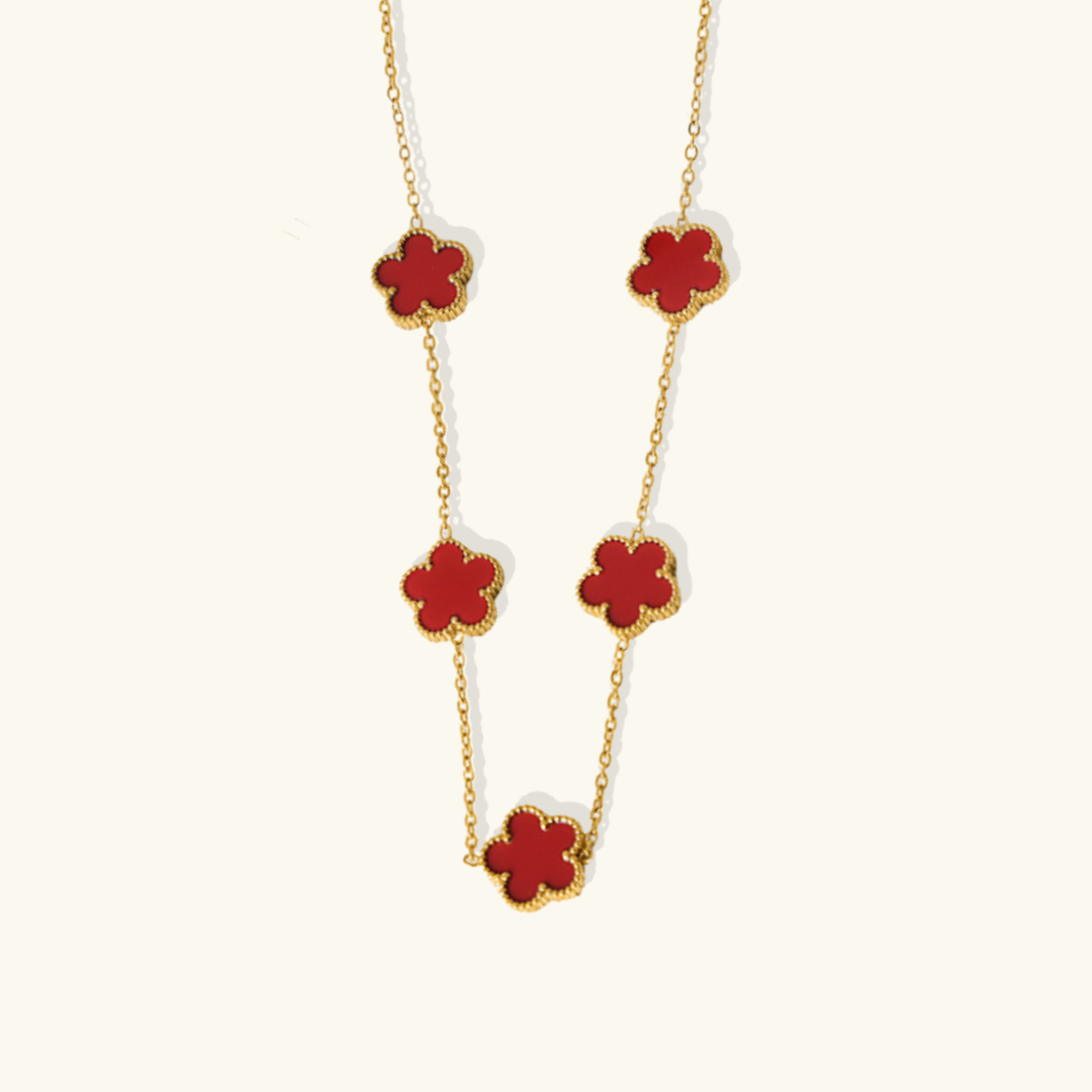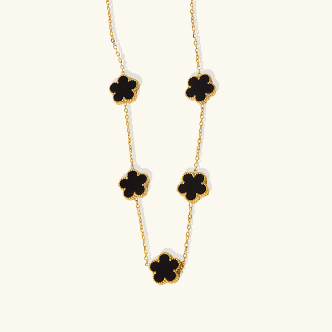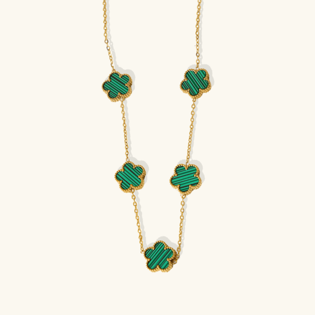 The Iconic Clover Necklace is a symbol of timeless elegance and good fortune. Each pendant, shaped like a delicate five-leaf clover, glistens with a polished finish, capturing the light in a dance of subtle brilliance. Suspended from a fine chain, the clover embodies both grace and charm, making it a versatile piece for any occasion.