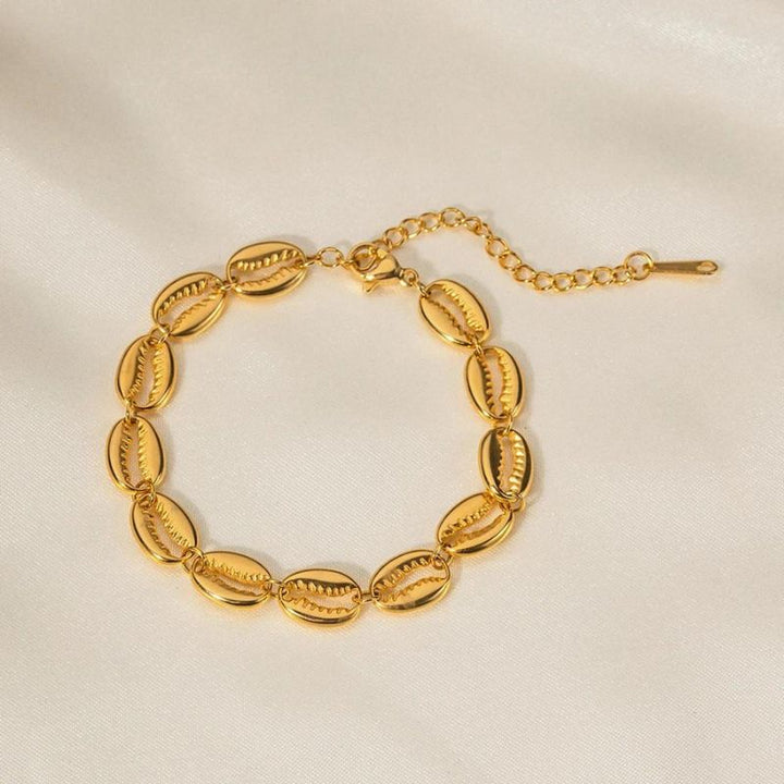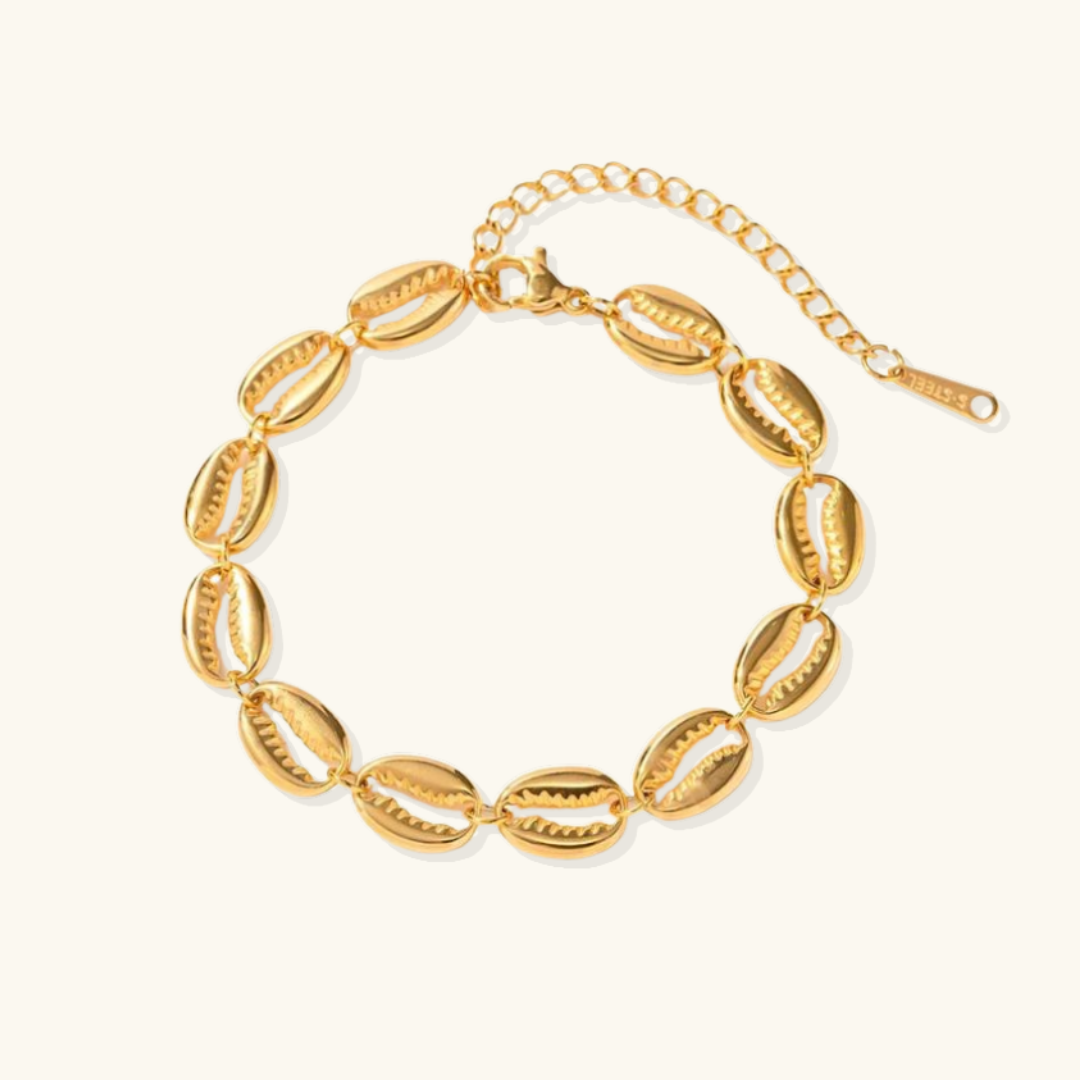 Inspired by the allure of the ocean, the Janelle Shell Bracelet encapsulates the timeless beauty of the sea. Each shell-shaped link, crafted in radiant gold, mirrors the delicate forms found along the shore, symbolizing strength and serenity.