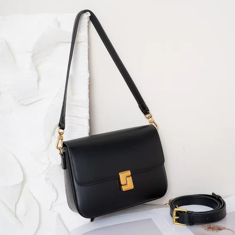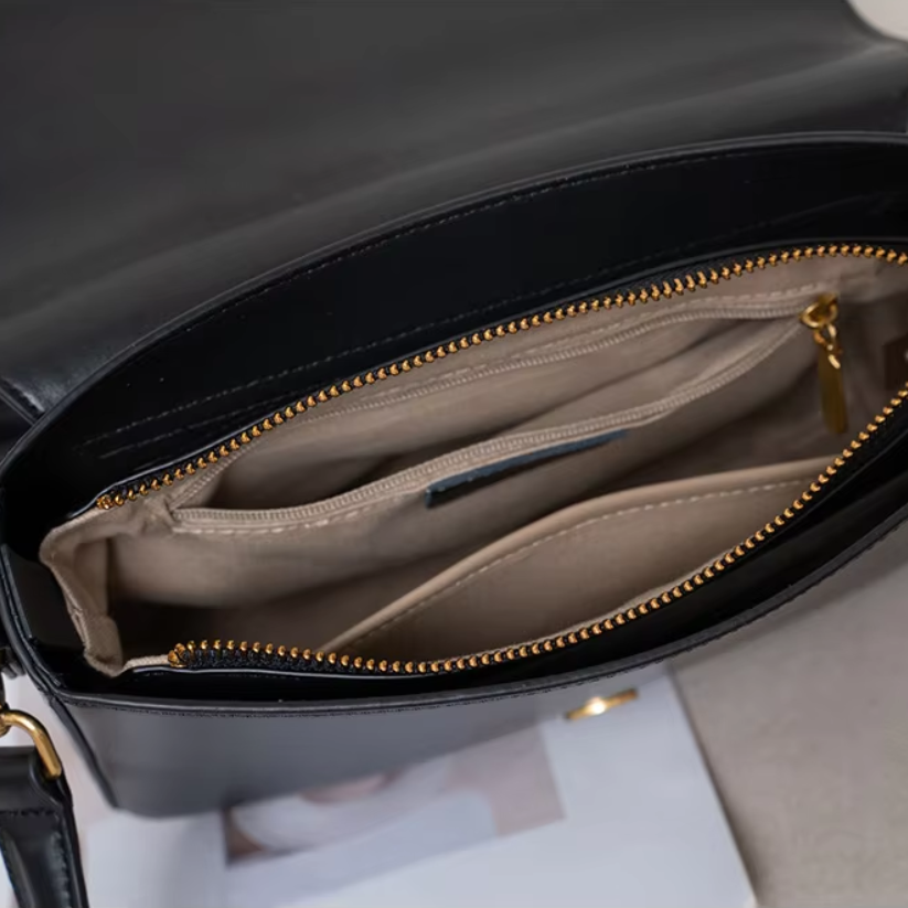 The elegant "Matea" shoulder bag made of the finest cowhide combines timeless design with high functionality. The smooth, durable leather gives the bag a luxurious look and ensures a pleasant feel. The removable and adjustable shoulder strap allows the bag to be worn over the shoulder or crossbody, depending on your style. A special highlight is the gold-colored decorative buckle, which gives the bag an elegant accent and stylishly underlines the minimalist design.