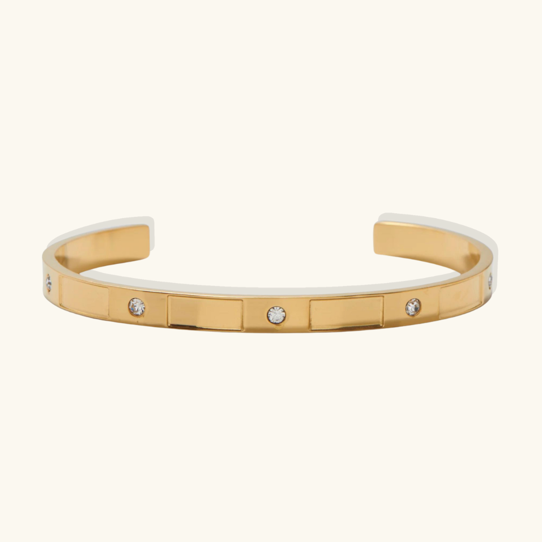 The Megan Bangle embodies understated elegance with a touch of modern glamour. Its sleek golden band is punctuated by subtle, glistening stones that catch the light, evoking a sense of timeless sophistication. The rectangular detailing along the bangle creates a refined balance of geometry and sparkle, making it an accessory that effortlessly elevates any look.