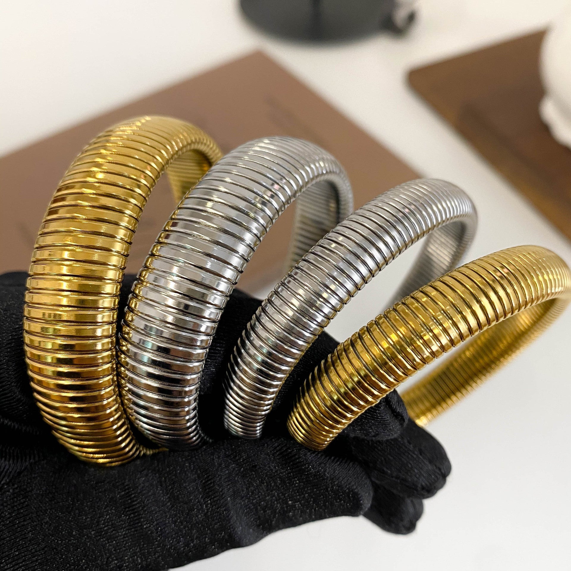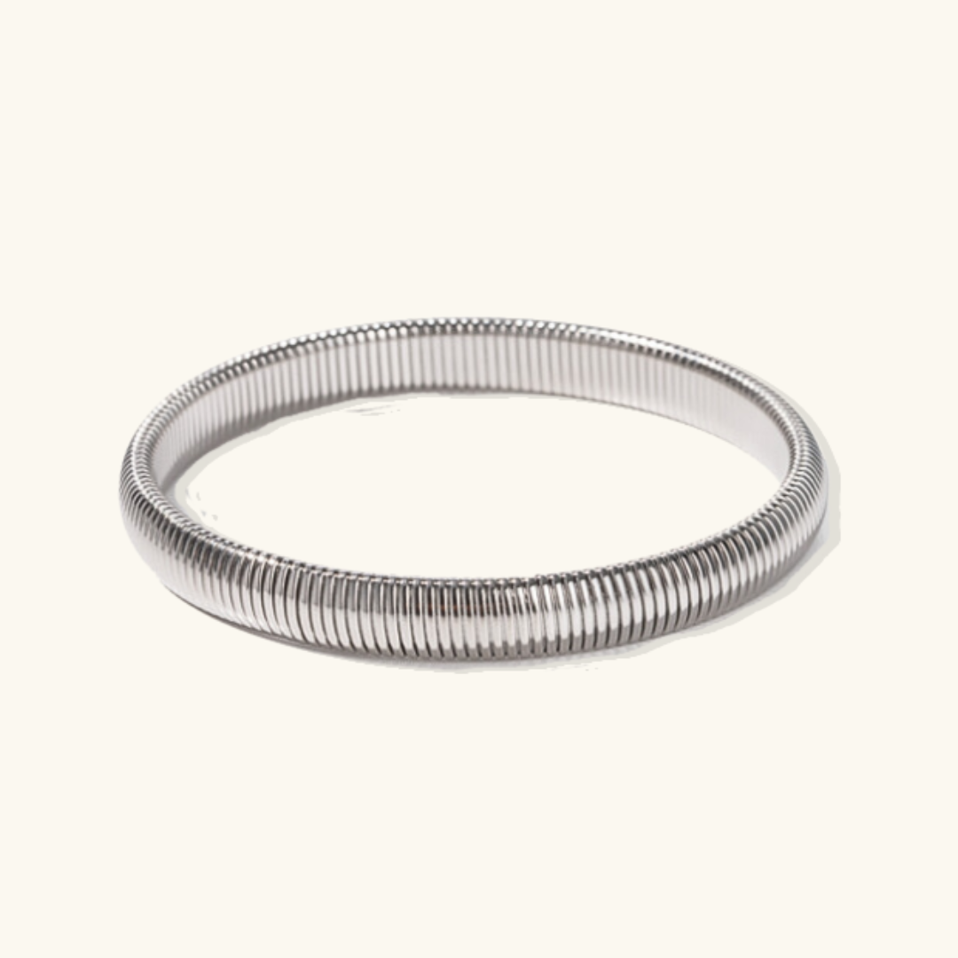 Embrace the allure of timeless elegance with the Mia Bangle Bracelet. This exquisite piece wraps around your wrist with a fluid, serpentine grace, reflecting light with its polished, ribbed surface. The seamless design exudes a modern sophistication, making it a versatile accessory for any occasion.
