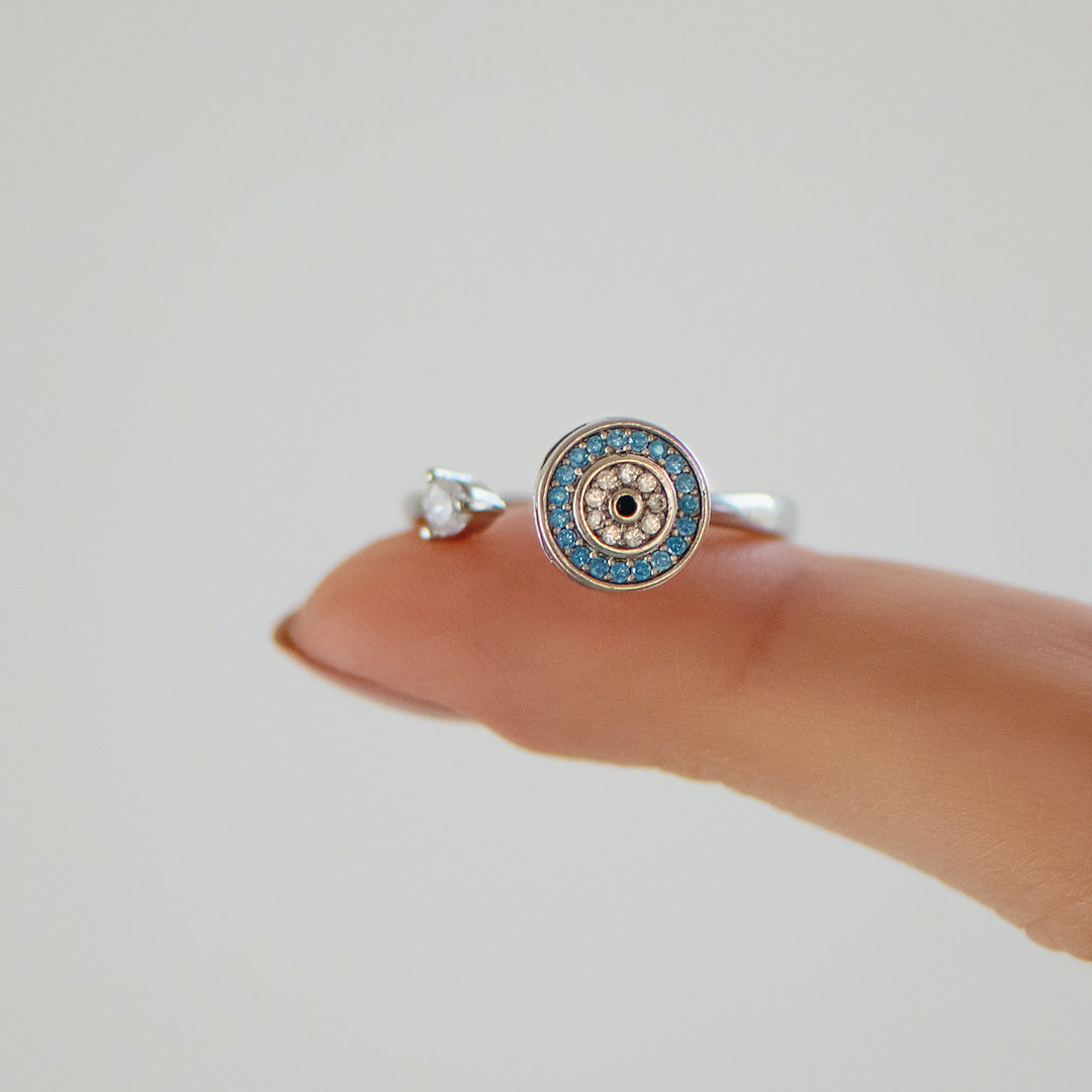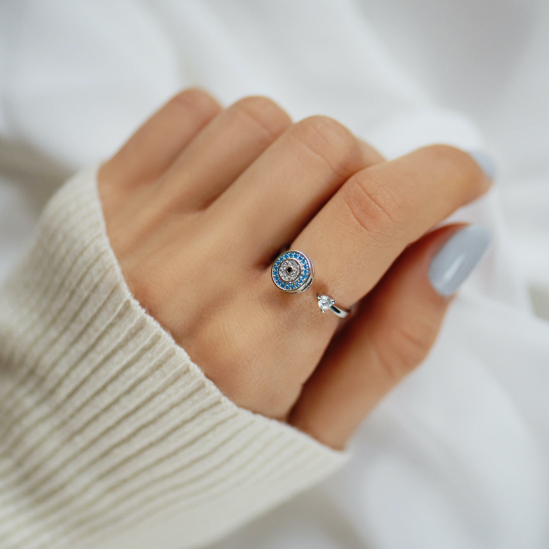 This beautifully crafted Evil Eye Fidget Ring features a unique design with a mesmerizing evil eye symbol, surrounded by intricate detailing. The evil eye has long been believed to ward off negative energy and protect you from harm.