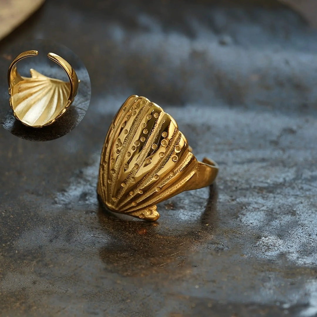 The Nellie Shell Ring is a bold embodiment of the ocean’s untamed elegance. This ring takes the form of a golden seashell, capturing the intricate textures of the ocean floor, with gentle ridges and delicate dots that emulate the natural beauty of marine life.