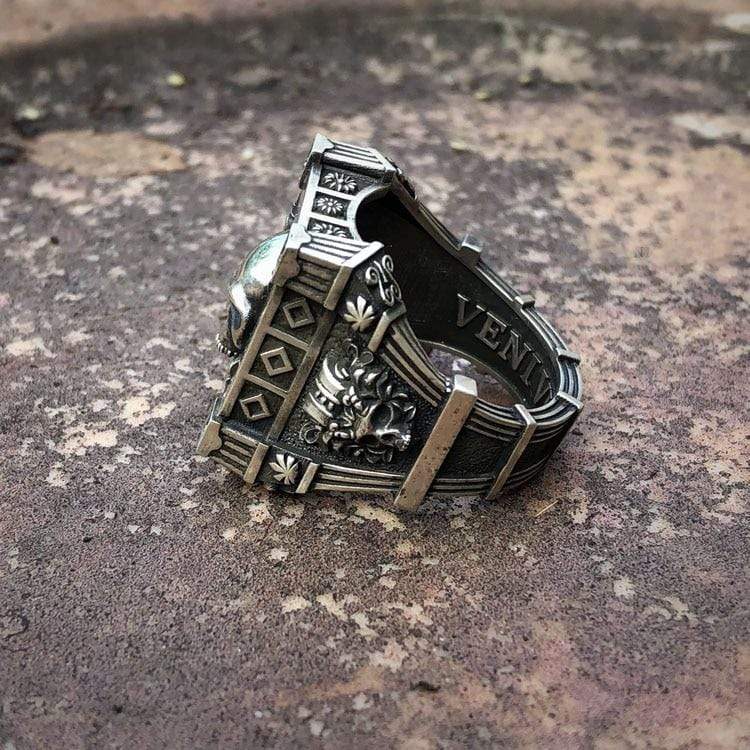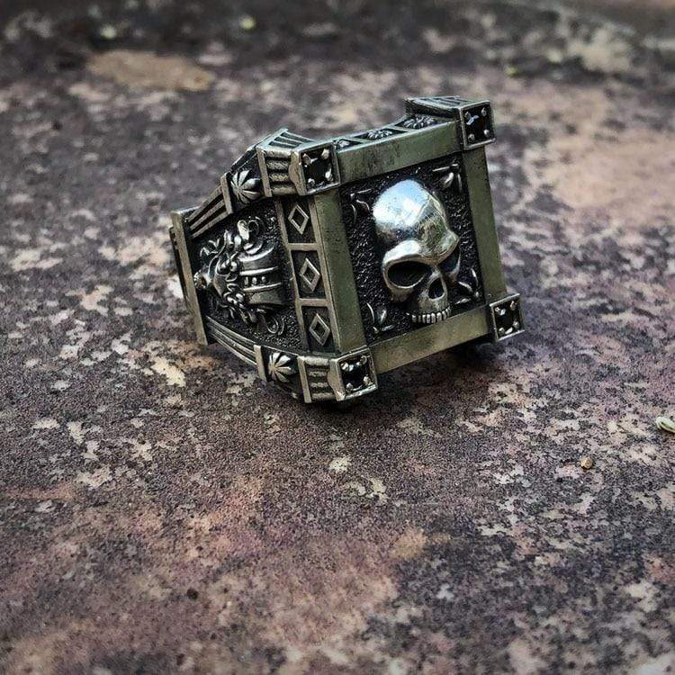 This is a well-made ring with outstanding detail. In its center is a skeleton surrounded by small flowers. It is flanked by two small, intricate skulls. It is fascinating and intriguing. The design of this ring is very unique and will surely attract attention. A real men's skull ring. Add them to your cart before they sell out!