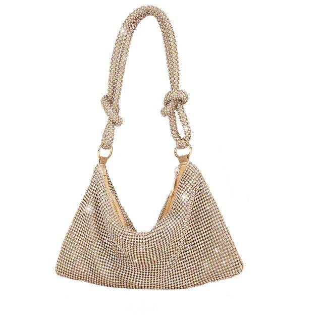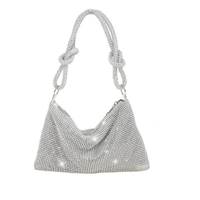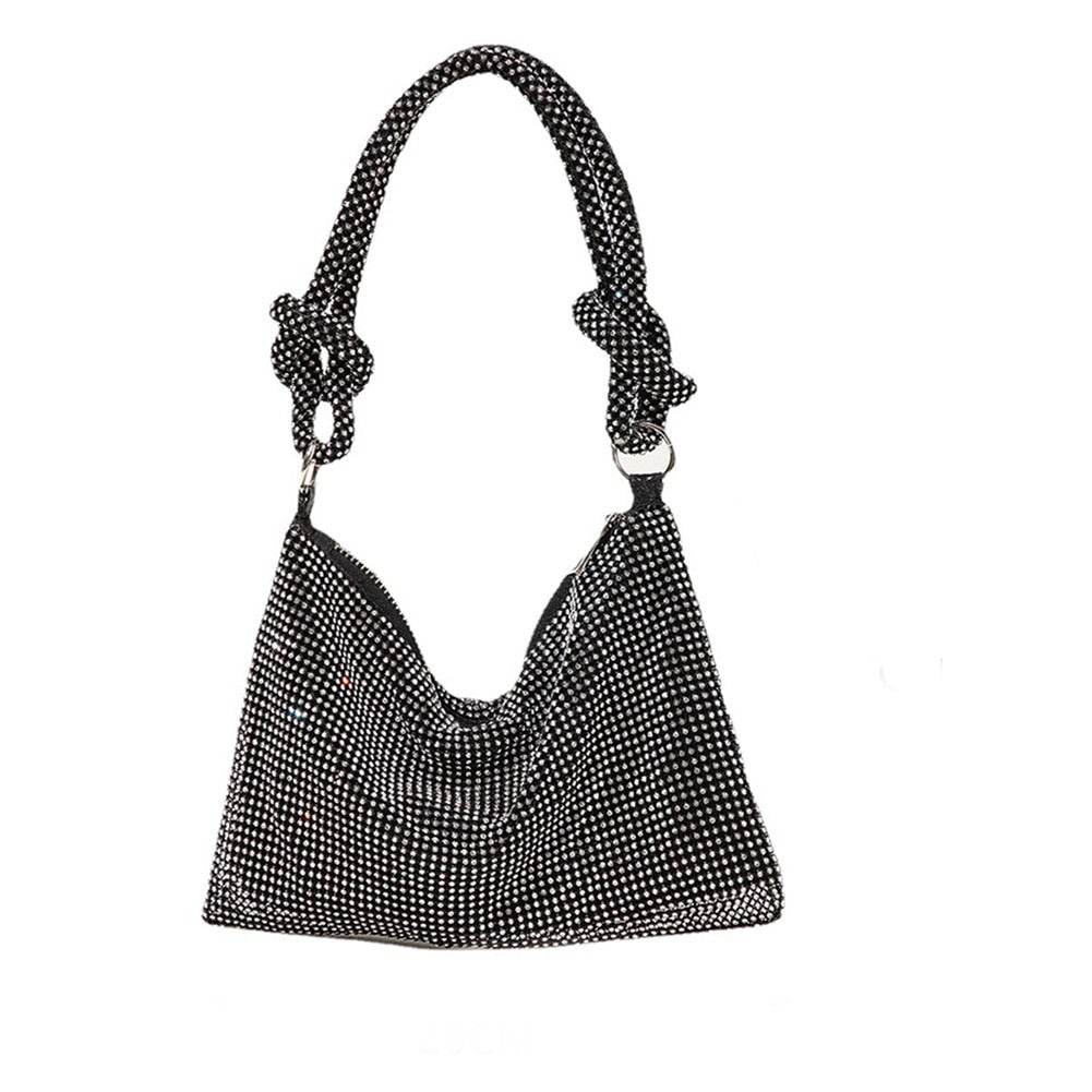 Make a statement with this dazzling Rhinestone Clutch Bag, Featuring a double knotted handle, decorated with gorgeous rhinestones and a slouchy shoulder bag design. This clutch bag will add a touch of glamour to your look and is perfect for formal occasions like weddings or gala events, as well as a night out with the girls. Let this eye-catching bag take your style to the next level!