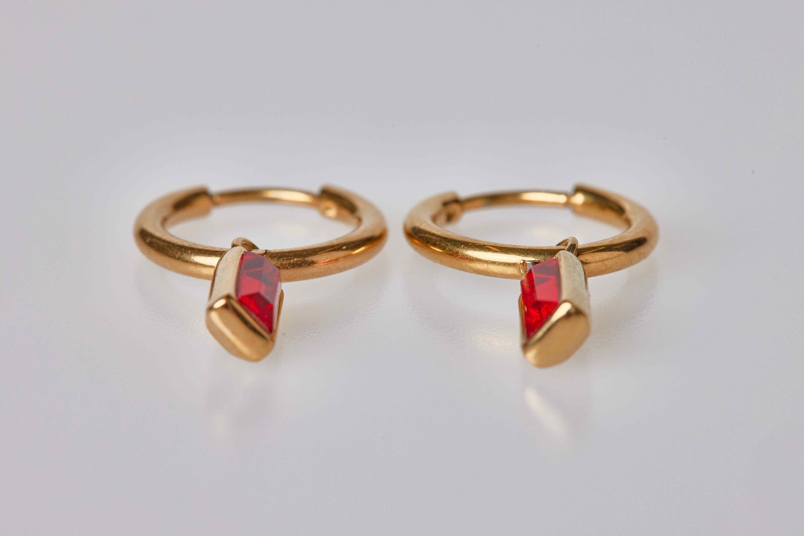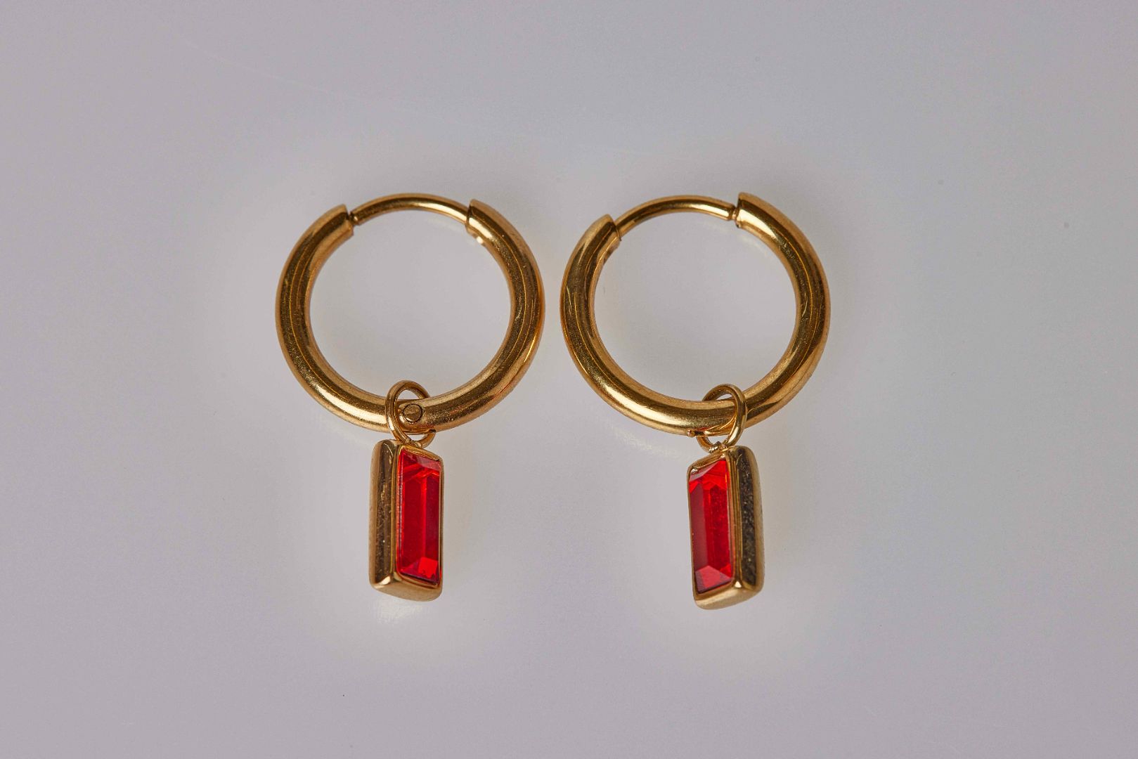 Immerse yourself in the opulent allure of Ruby Romance Earrings—a pair of dangle Huggies boasting a captivating red rectangular drop that defines timeless elegance. These earrings redefine sophistication with their grand design, effortlessly elevating your ensemble and adding a touch of refined allure to your look. With their distinctive dangle Huggie style, the Ruby Romance Earrings are a versatile accessory suitable for various occasions. Whether worn alone for a statement of refined opulence or paired with other earrings, they allow you to express your style with versatile grandeur, elevating your ear game with a touch of sophisticated allure.