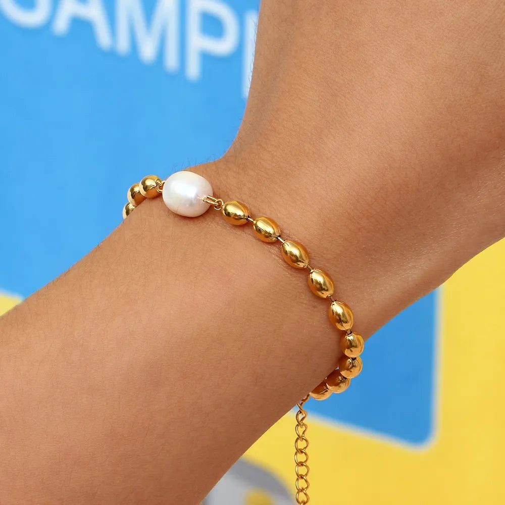 Delicately suspended between the tides of elegance and the glow of golden allure, the Sabrina Pearl Bracelet encapsulates timeless sophistication. Featuring lustrous gold-tone beads that resemble glistening water droplets, this bracelet is crowned with a singular, organic freshwater pearl. Its design embodies a fusion of classic and contemporary, a piece that whispers of serene seas and radiant skies.