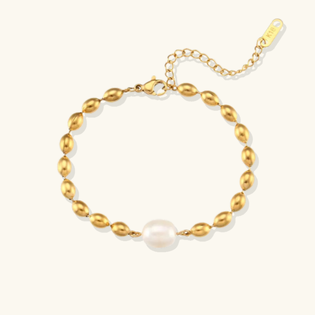 Delicately suspended between the tides of elegance and the glow of golden allure, the Sabrina Pearl Bracelet encapsulates timeless sophistication. Featuring lustrous gold-tone beads that resemble glistening water droplets, this bracelet is crowned with a singular, organic freshwater pearl. Its design embodies a fusion of classic and contemporary, a piece that whispers of serene seas and radiant skies.