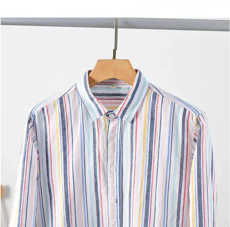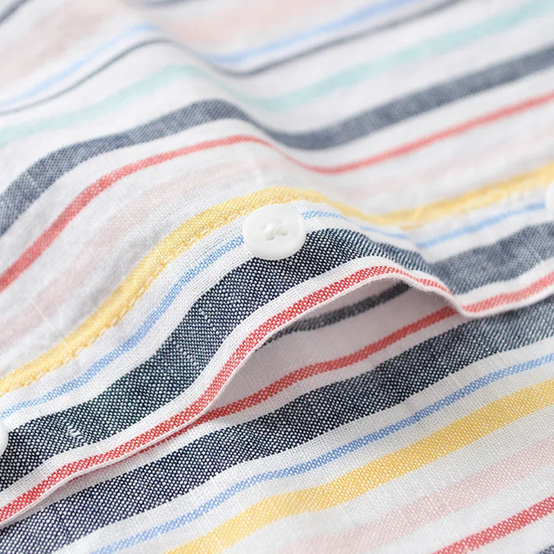Crafted from a premium blend of linen and cotton, this versatile piece features a refreshing vertical stripe pattern in pastel hues, perfect for both casual and semi-formal occasions. The lightweight fabric ensures comfort and breathability, making it an ideal choice for warmer weather. Whether paired with jeans for a relaxed look or chinos for a more polished appearance, this shirt is designed to elevate your wardrobe with its modern yet timeless appeal.