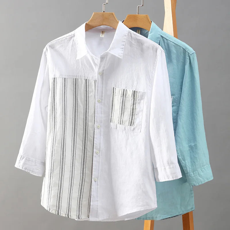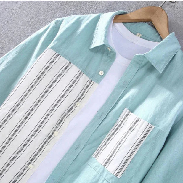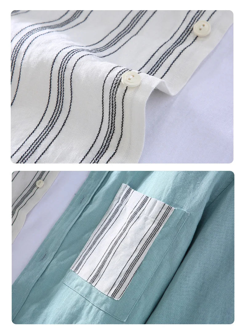 This eye-catching piece features a harmonious blend of solid lagoon blue and vertical stripes, exuding a modern, coastal vibe. Crafted from premium linen, it offers unbeatable comfort and breathability, perfect for warm-weather days. The unique pocket design a touch of laid-back sophistication, making it versatile for both casual outings and more refined occasions.
