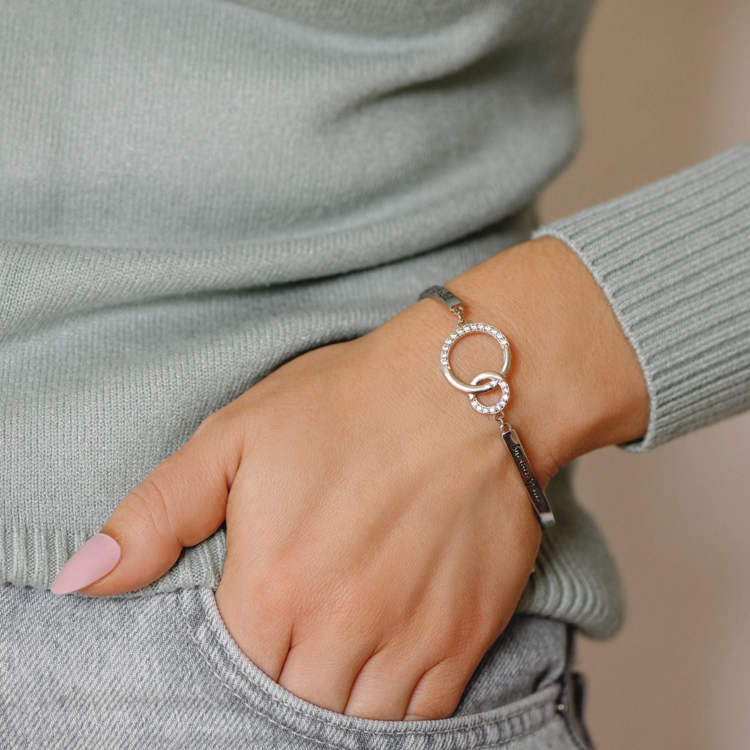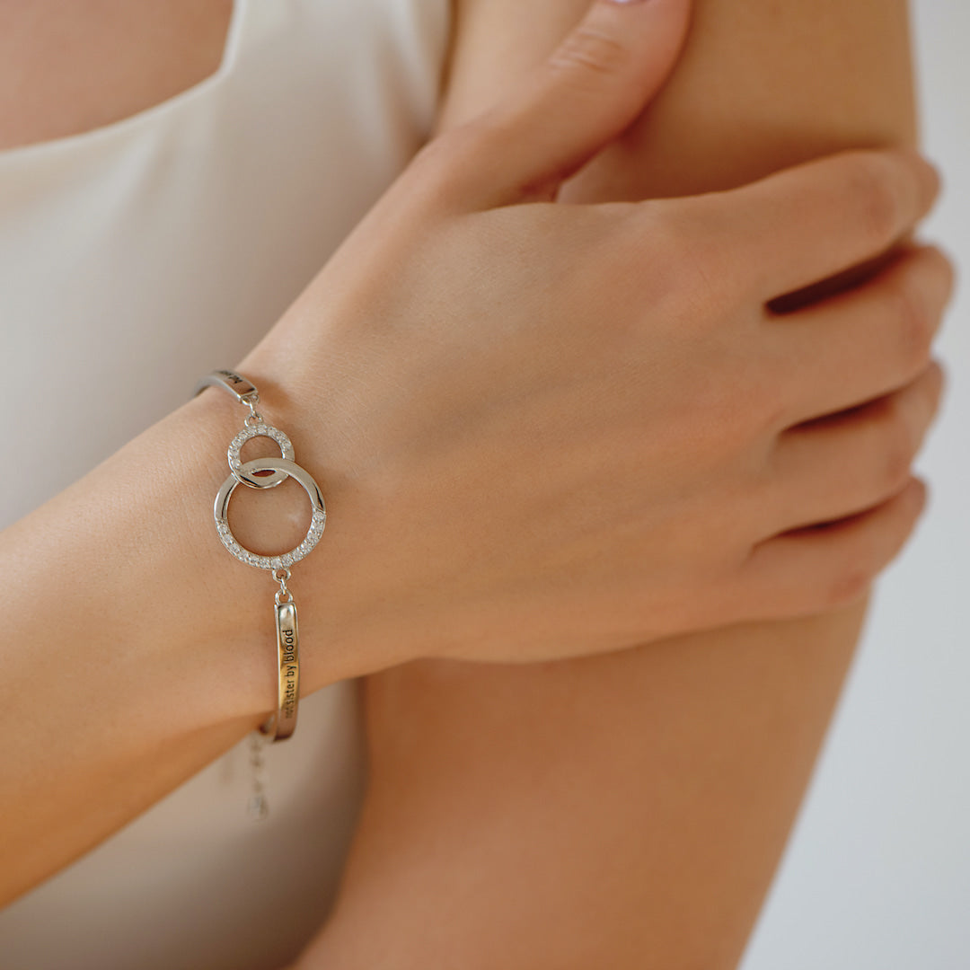 Our beautiful Sisters bracelet is the perfect way to express the unbreakable bond between you and your best friend. This bracelet comes with two intertwined rings, symbolizing a strong bond between loved ones. It also has the engraved words “Not sisters by blood but sisters by heart”.