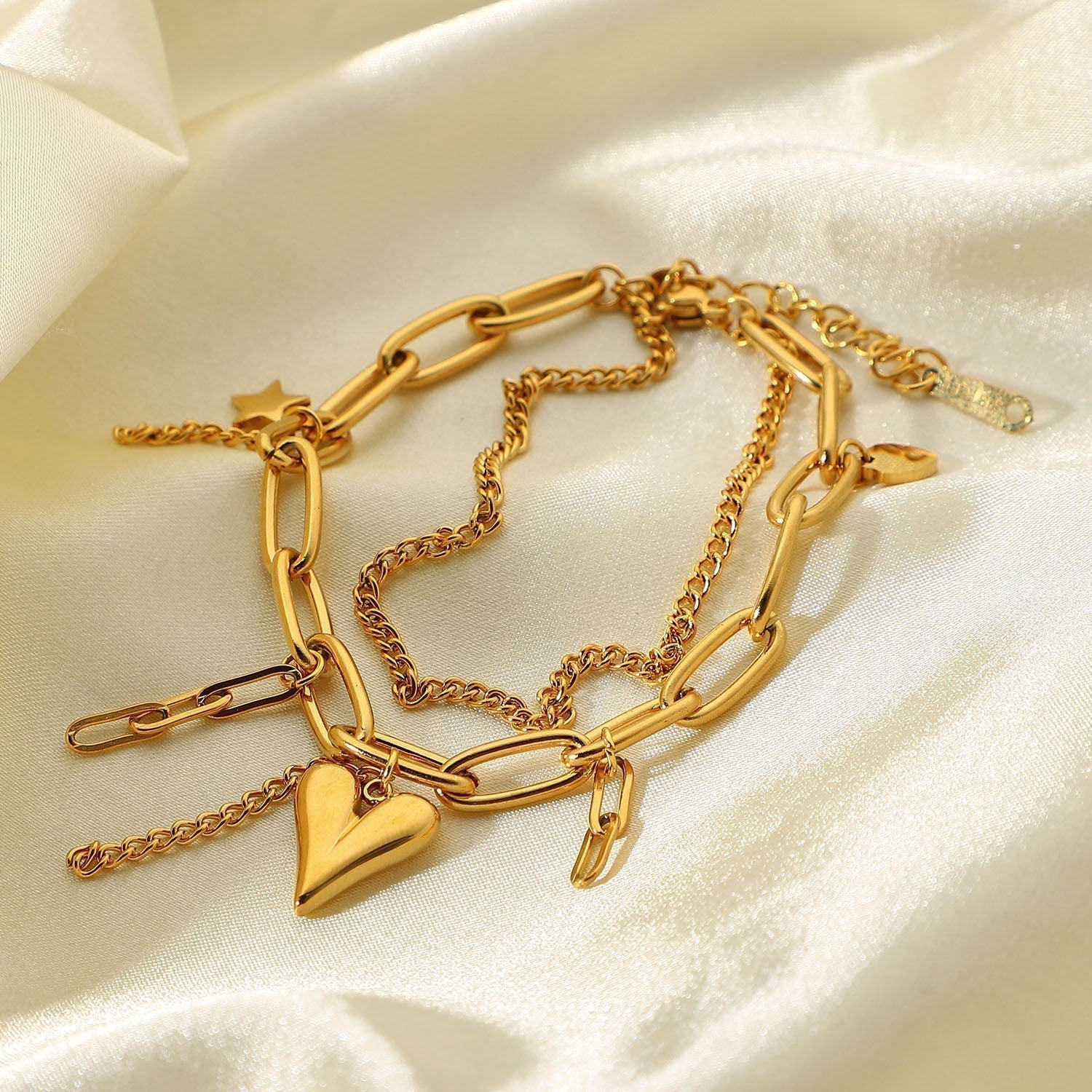 These bracelets feature a star and heart layered chain design, giving them a unique look. They are made from high quality material, so they are sure to last. The star and heart design adds a touch of sparkle to any outfit, making them the perfect accessory for any occasion. Whether you are looking for something to wear to a night out or just something to add a bit of sparkle to your everyday look, these bracelets are a great choice.
