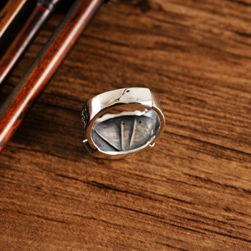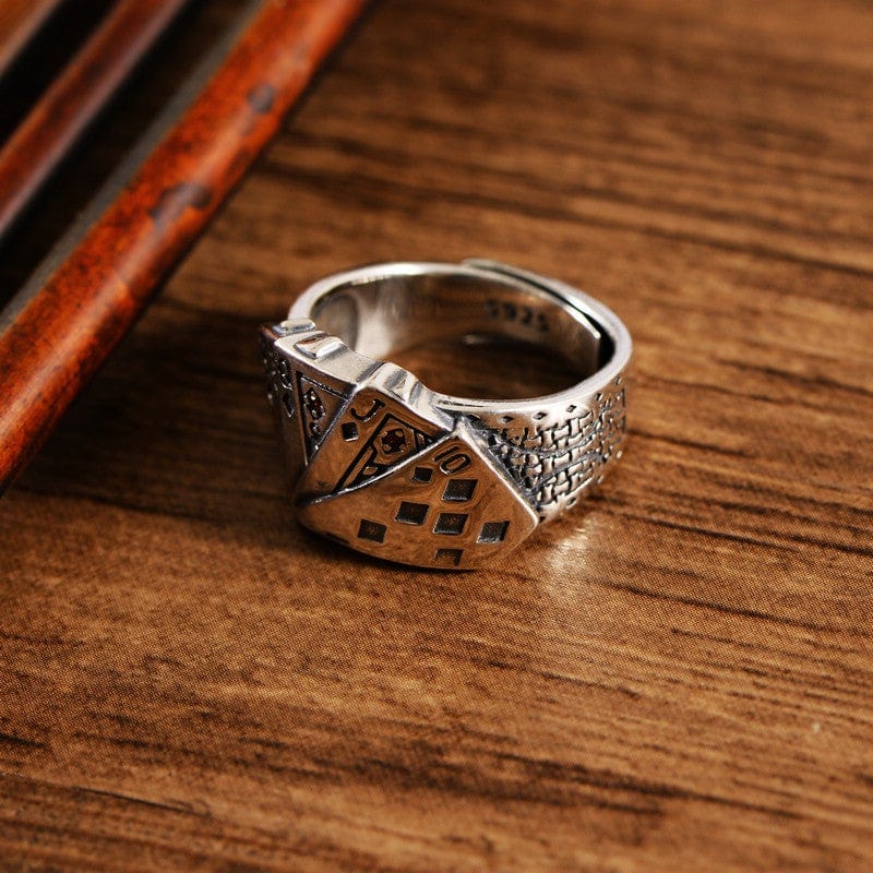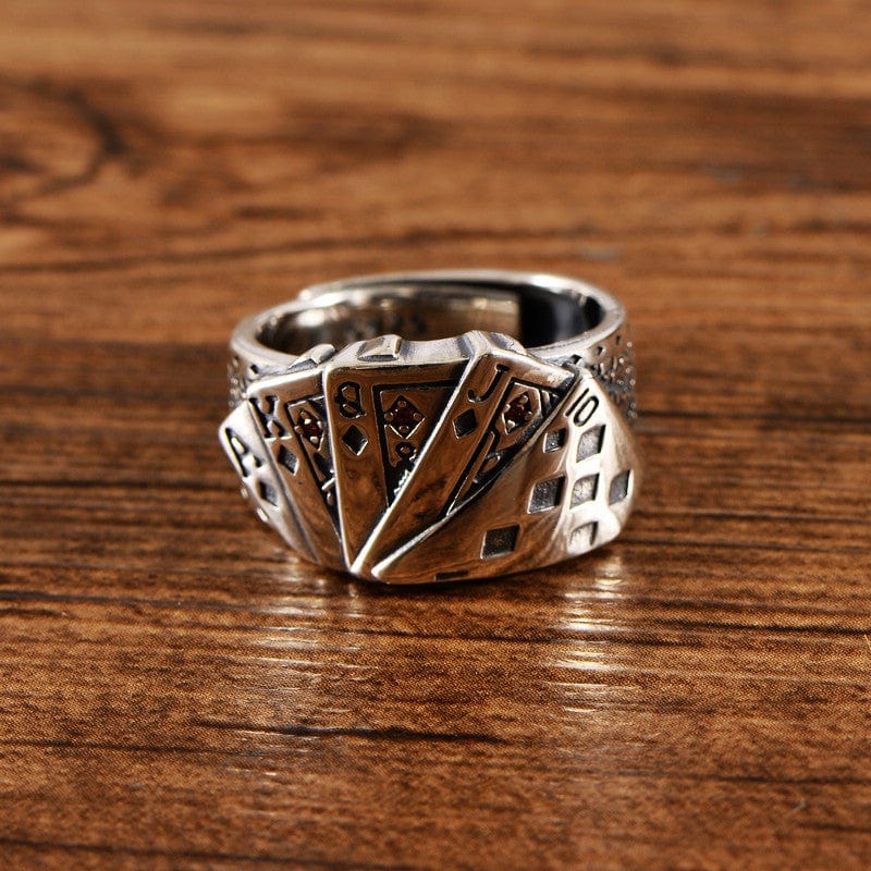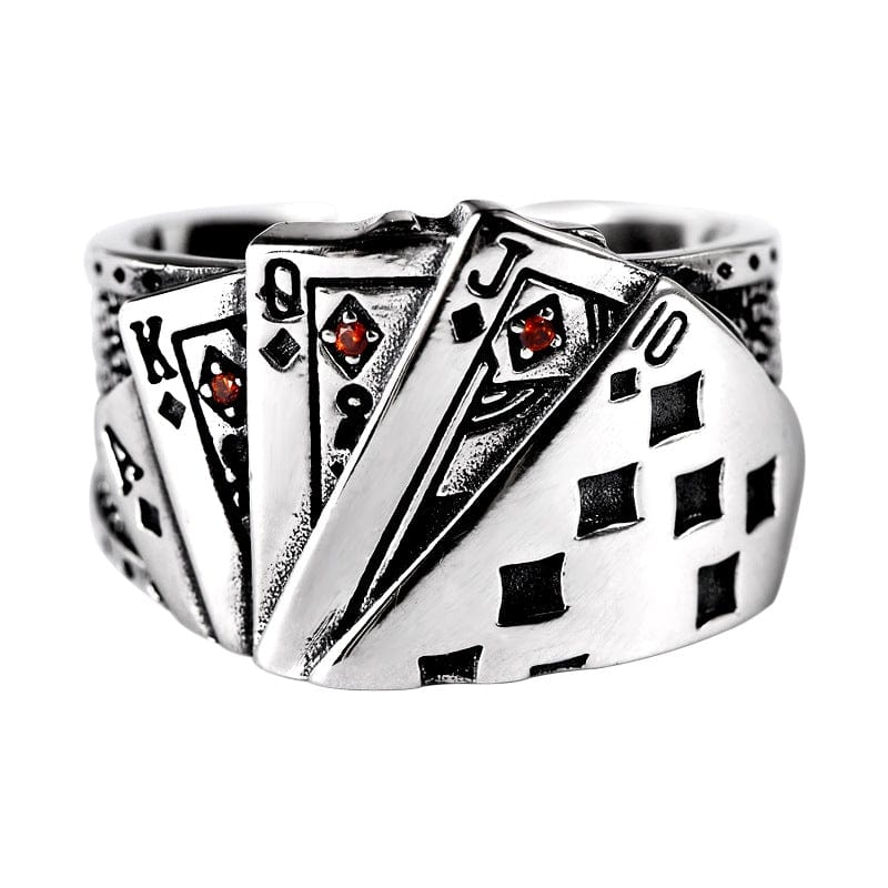This ring is made of 925 silver with the theme pattern of straight flush playing cards. Straight flush means a poker hand that is both straight (the cards are all in sequence) and