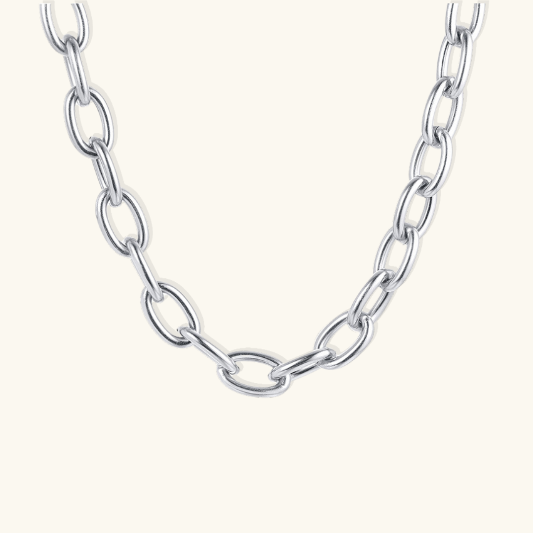 Powerful yet timeless, the Thalia Necklace redefines bold elegance. With its commanding oval chain links in polished gold and silver finishes, it becomes a symbol of unyielding sophistication and versatility. Each link is a testament to strength and connection, blending modern edge with classic refinement.