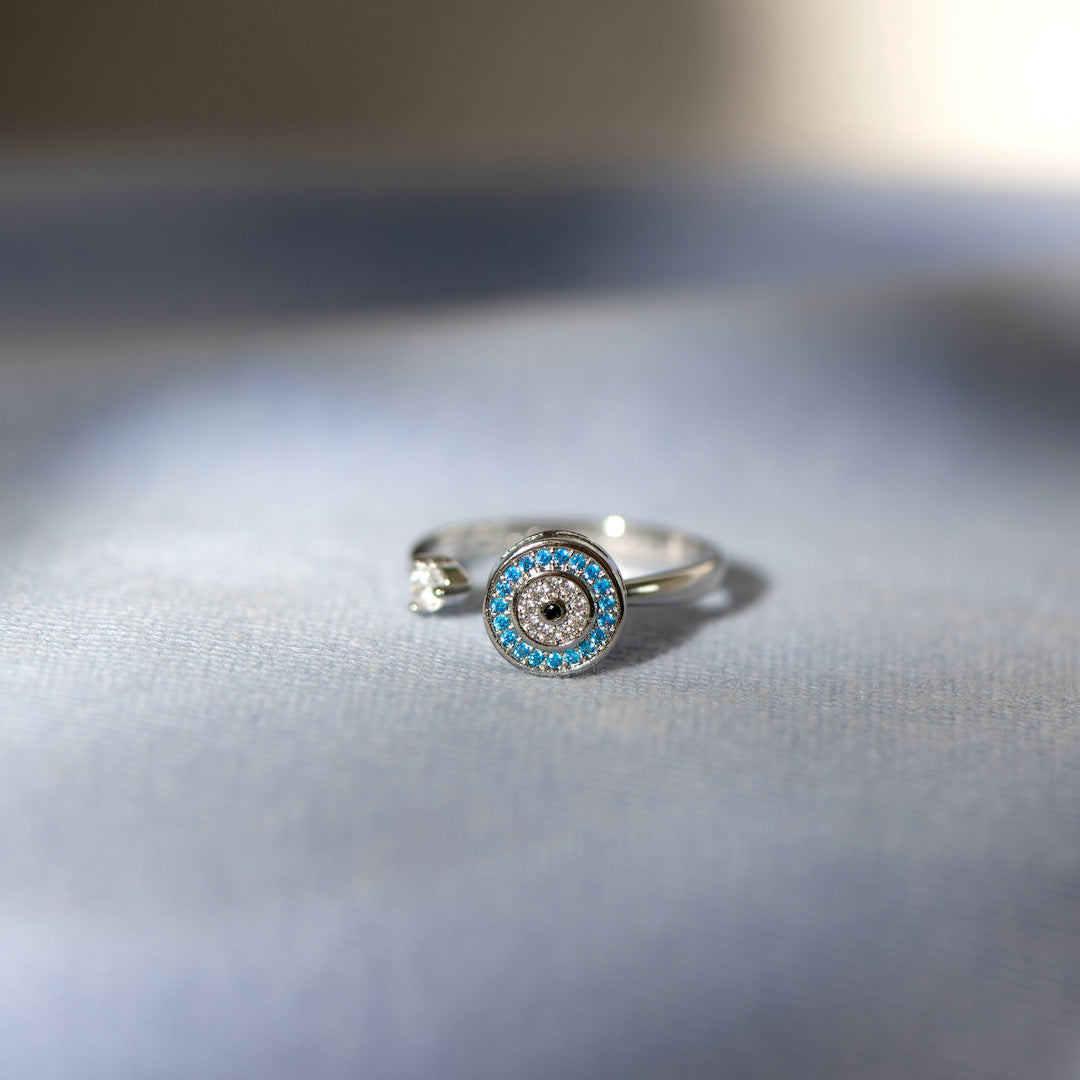 This beautifully crafted Evil Eye Fidget Ring features a unique design with a mesmerizing evil eye symbol, surrounded by intricate detailing. The evil eye has long been believed to ward off negative energy and protect you from harm.