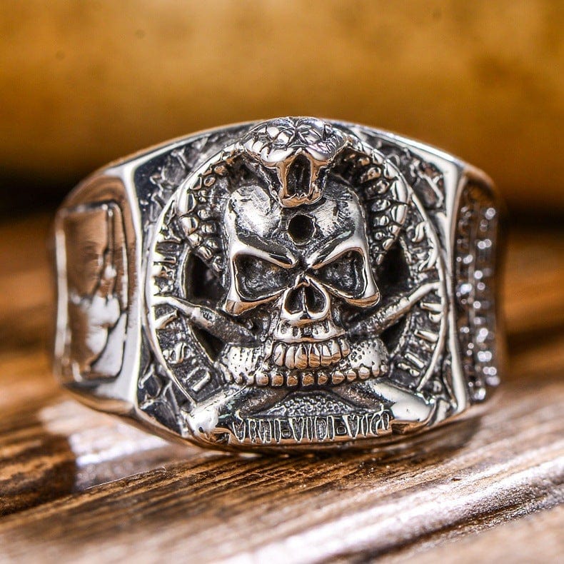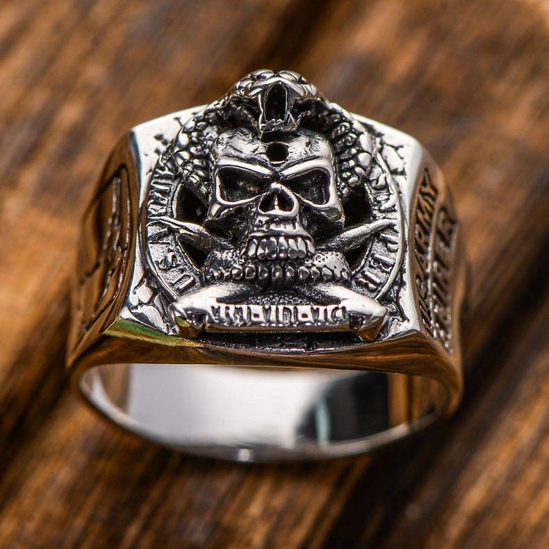 Charming and full of meaning, that's the first impression this ring makes. The ring is made of 925 silver for durability. The front motif consists of a skull and cobra, very handsome, show off your biker pride with this charming ring. This ring is made to last and to handle whatever life or the road throws your way. This ring will add a distinct detail to your look. Men's silver ring, skull rings for men!!
