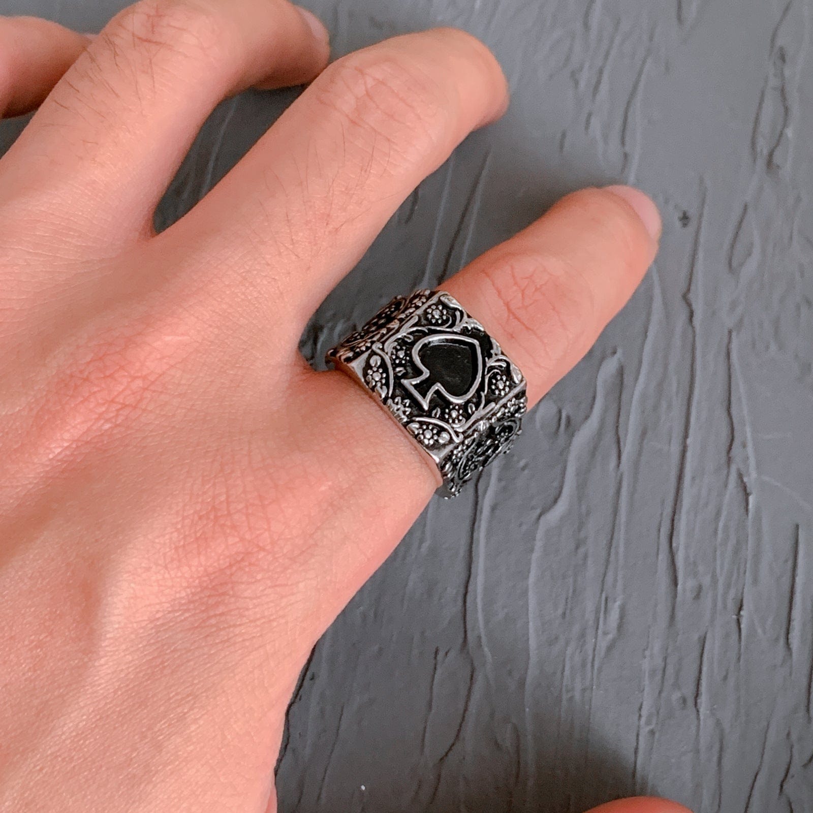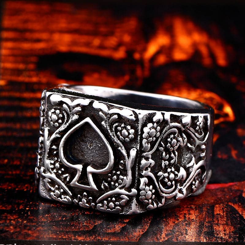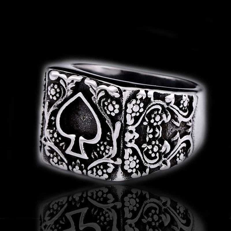 Produced from high-quality stainless steel, this poker ring is thick and heavy yet exceptionally detailed. Its carefully crafted design is built to last and handle even the roughest times. This stainless steel ring makes a real statement when worn and is sure to grab desirable attention. Truly rings for men, truly men's stainless steel rings.
