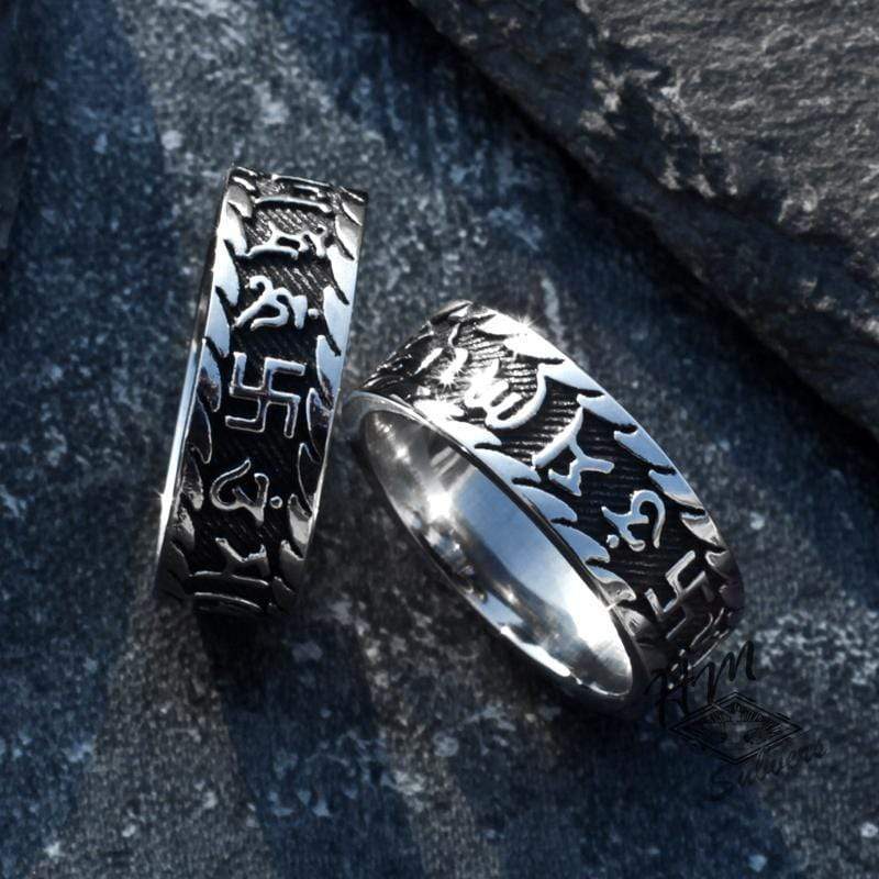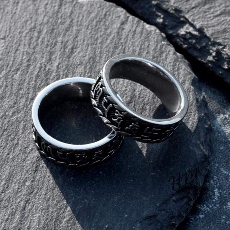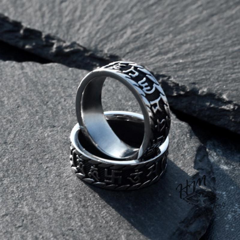 This Sanskrit ring is made of high quality stainless steel, is thick, and exceptionally detailed. This meticulous piece of 316L surgical stainless steel, designed by our senior jewelers, is the highest grade of stainless steel in the jewelry industry.It will never tarnish... Rust... Corrode... Discolor... or leave stains on your fingers. Plus, it requires no maintenance to maintain its original "fresh out of the box" mechanical feel. Buy one for each of you.A real men's ring.